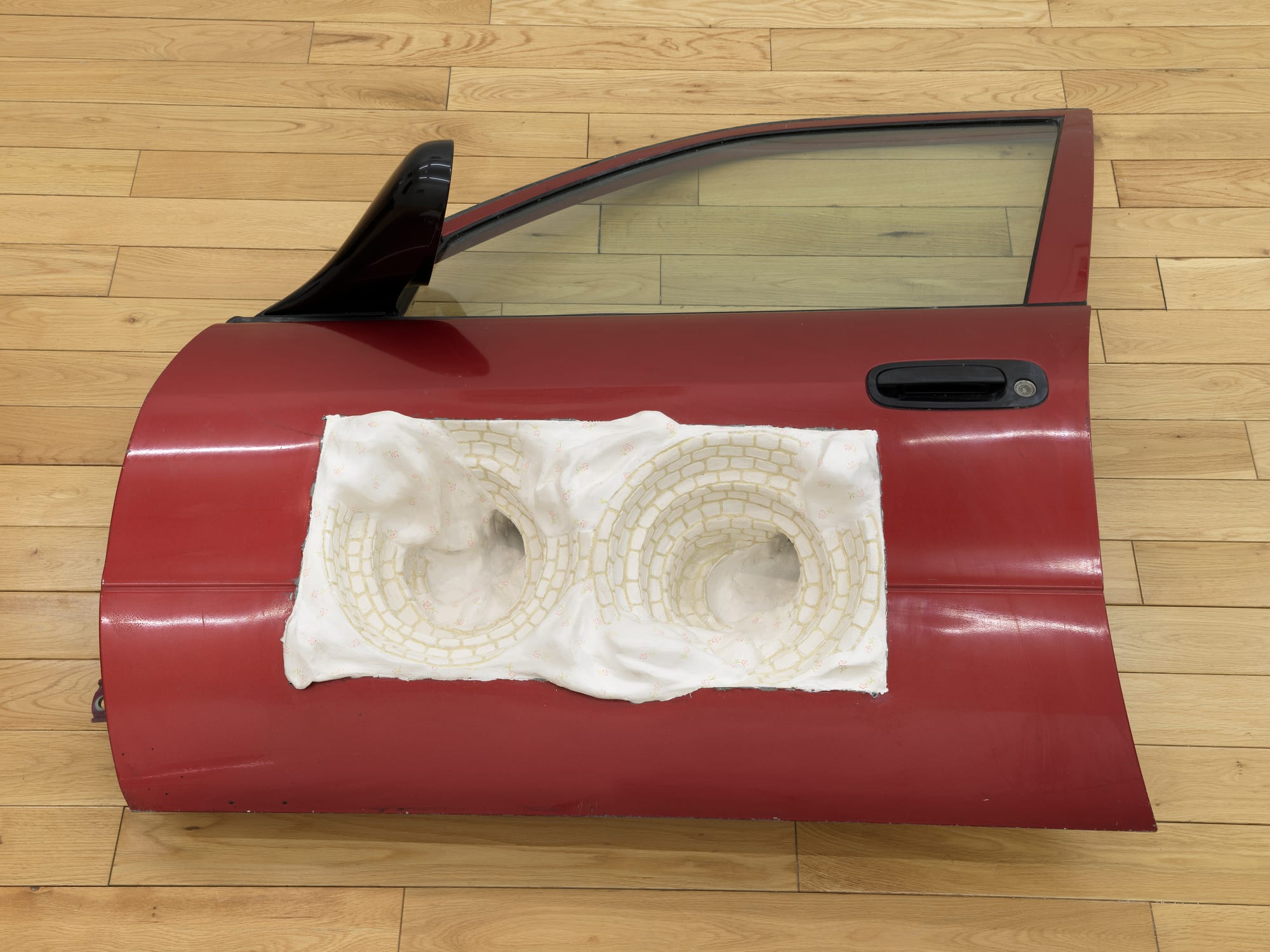 For “Front Door Floral Sheet” (2019), in her 2019 Chapter NY show, Kelly carved a recess in a car door, laid flat on the floor, and filled it with a plaster cast of two tiled drains. The orientation allowed viewers to look down at the drains, but not into them; this detail added an element of mystery to a work whose incongruous surfaces and collision of reality and illusion were already inflected by Surrealism. (From a certain perspective, the drains could be two eyes, placed directly below the car window.)