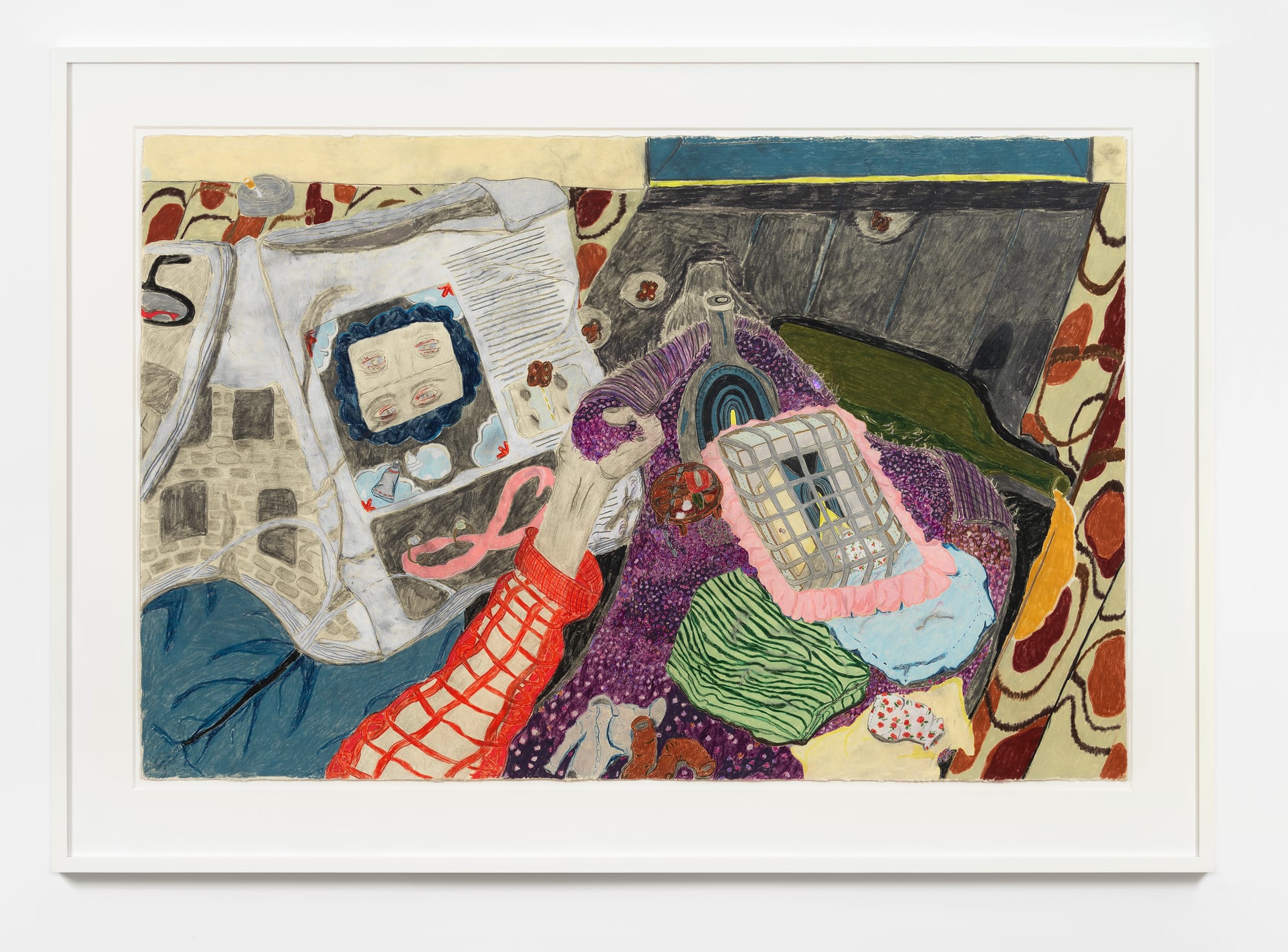 Kelly’s colored-pencil drawings include many of the same everyday items and motifs as her sculptures, such as tires, clothing, chairs, and drains, but her flat, all-over compositions reduce these to biomorphic forms and patterns. In “Still Life Studio Door” (2019), for example, a glass, apple, and mesh basket on a table reiterate the table’s round surface, while shapes within shapes (as in the basket’s weave) echo a brick wall, metal door, and plastic chair.