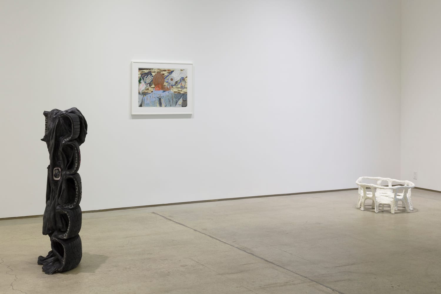 On a recent visit to Ann Greene Kelly’s Los Angeles studio, she showed me a selection of plastic mugs in various sizes and colors, at least one comically oversized. She was thinking about integrating one into a sculpture in progress composed of car tires and a metal folding chair, both of which are common elements in her work. The mug would be a new feature, inspired, she said, by paintings of coffee cups by Elizabeth Murray.