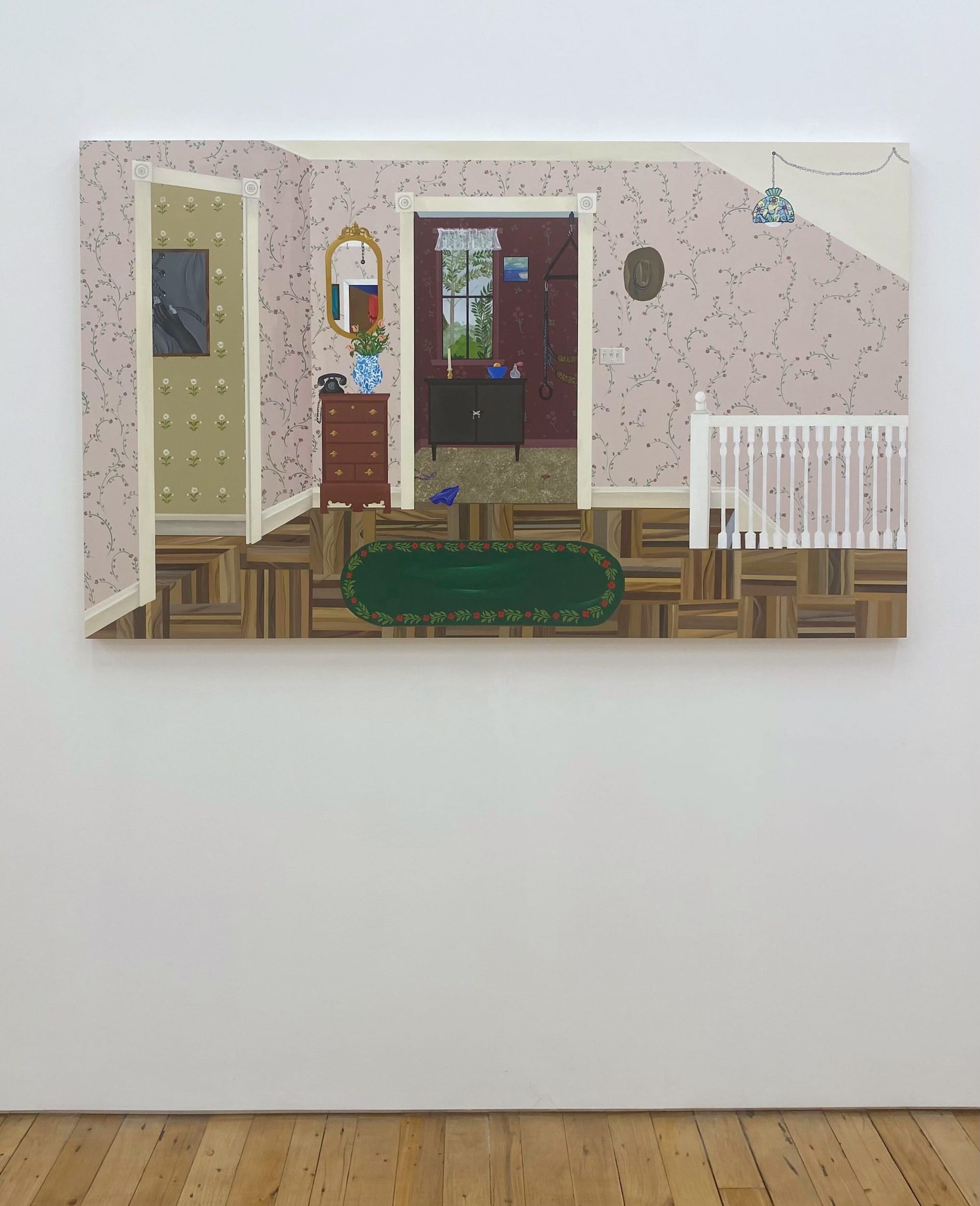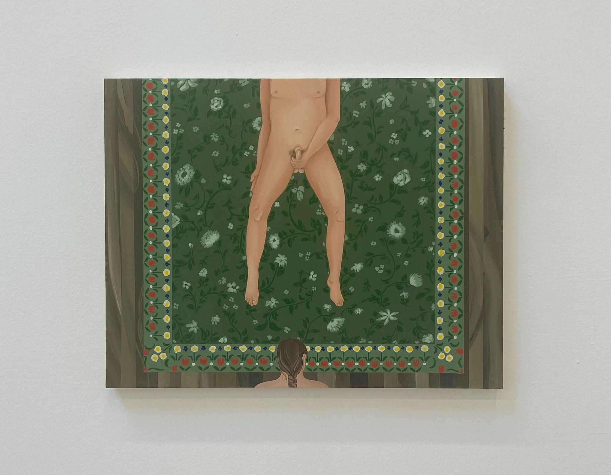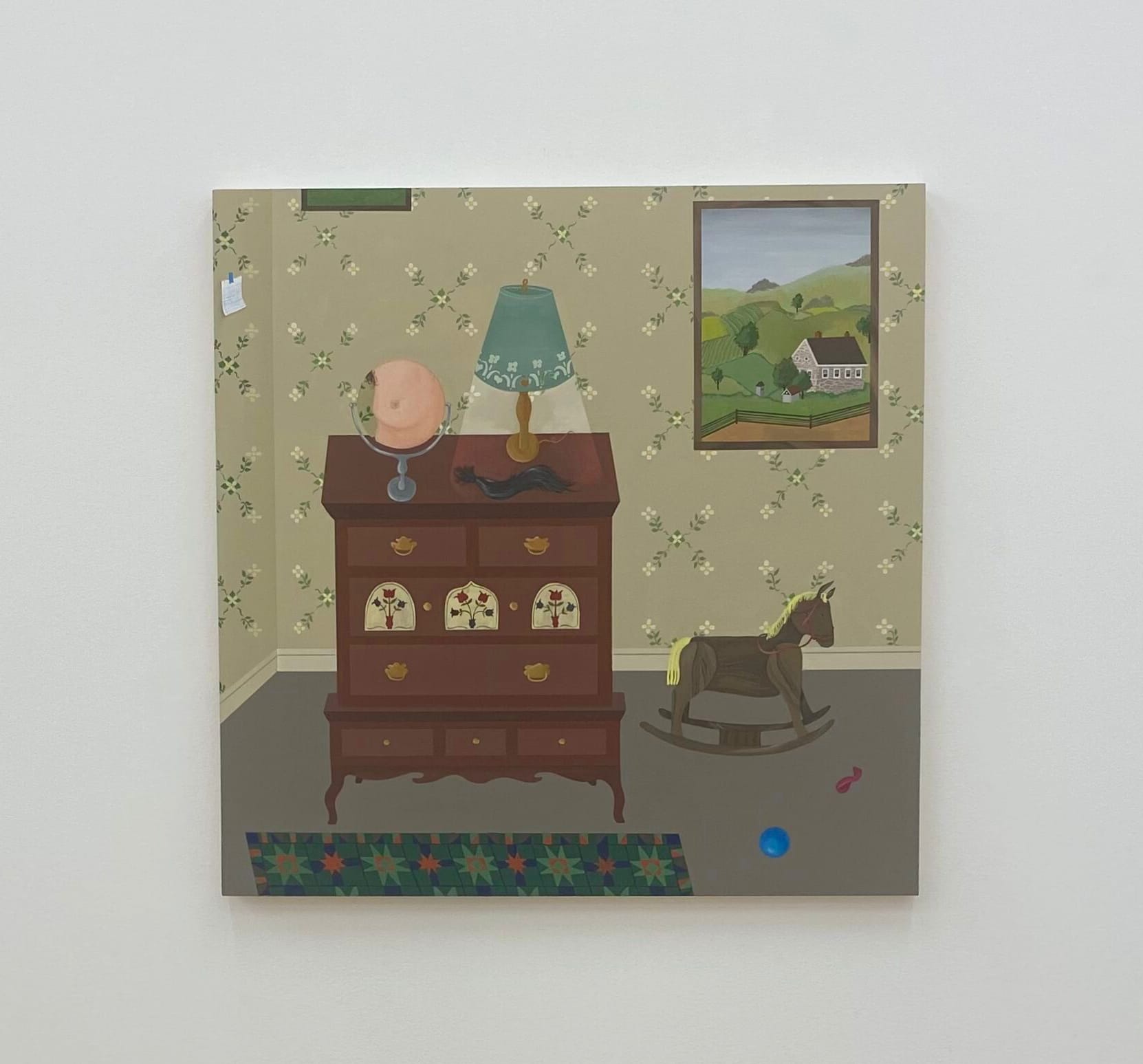 Rendered in crisp gouache on smooth panel, the paintings on view (all 2023) mirror the flatness of the folk art tradition from which the artist draws inspiration. Each interior resembles a relatively ordinary vignette with clean, orderly rooms and objects neatly arranged. Many are unoccupied, or seemingly so. However, a closer glance reveals evidence of human activity, specifically suggestions of carnal acts in glimpses of sex toys, pornography, and underwear. When people are present, they are seen partially through windows, doorframes, and computer screens, or reflected in mirrors. What happens outside the scope of each work is up to the viewer to decide.
