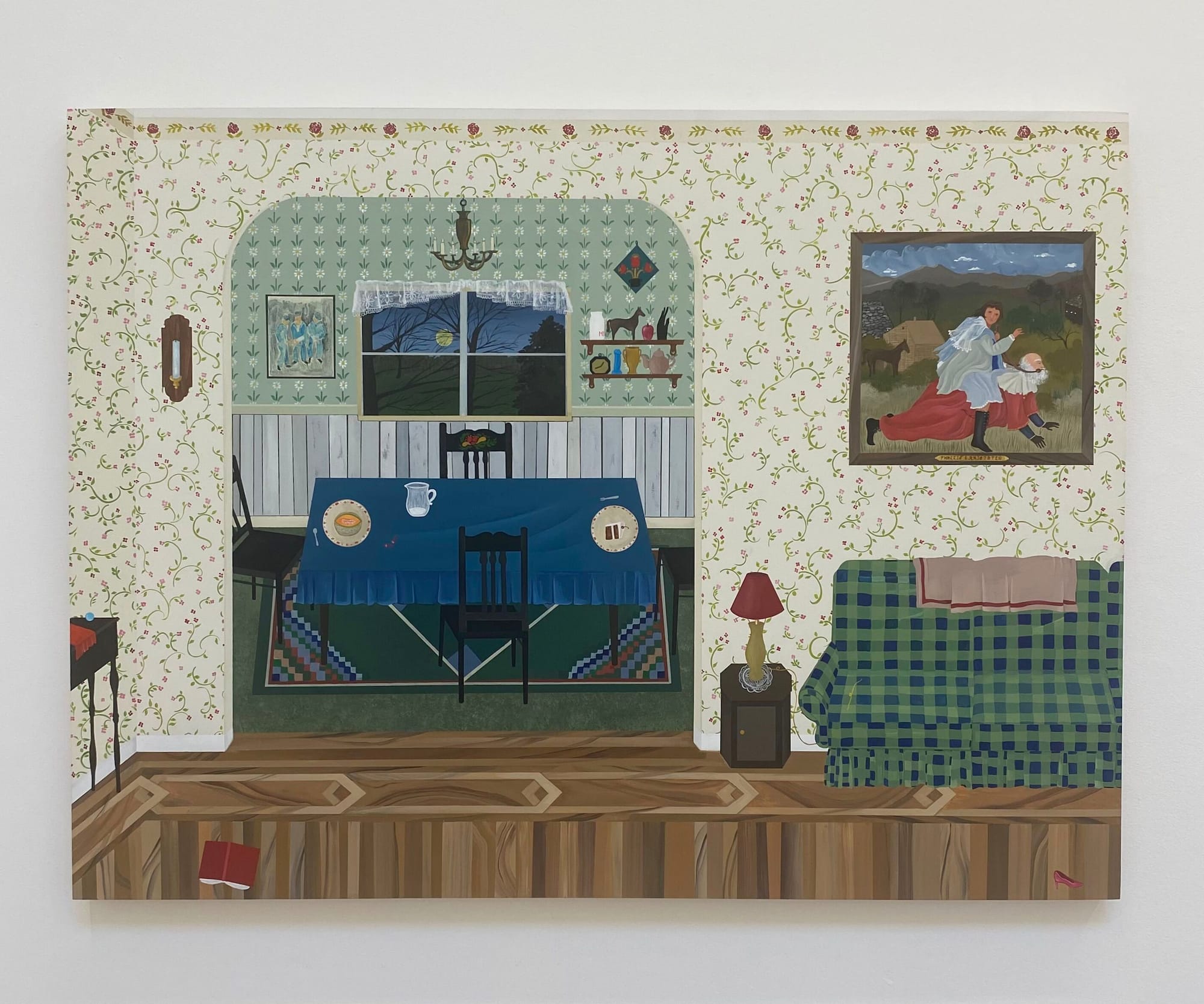 Like a salacious game of eye-spy, Buckwalter’s paintings invite viewers to share in a semi-secret rendezvous. Some works contain cheeky objects like ropes, lingerie, and butt plugs, lined up and ready for use. In others, the risqué items are less conspicuous, such as the blue dildo arranged neatly on a shelf alongside a horse figurine, milk jar, and teapot in “The Moon’s Too Bright/The Chain’s Too Tight.” A painting of a young figure in colonial garb riding a gagged man like a horse hangs on the wall in the same piece.