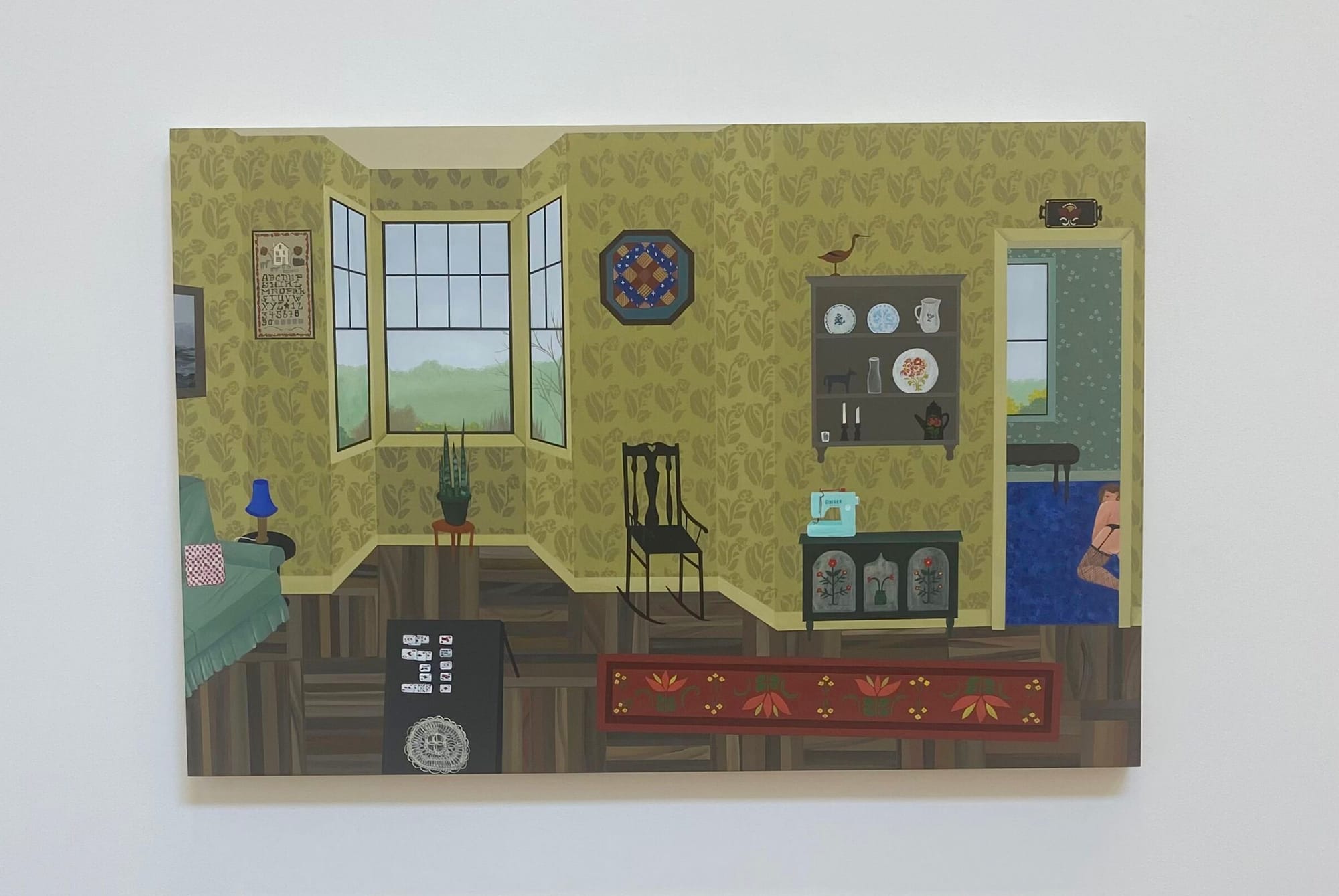 When Europeans immigrated to southeastern Pennsylvania over 300 years ago, they brought with them an aesthetic vernacular that became known as Pennsylvania Dutch folk art. The style—characterized by decorative repeated motifs, including flowers, stars, and birds depicted in a colorful, flat manner — adorned textiles, wood furniture, and household objects. The tradition conveyed the agrarian culture’s appreciation of nature, family, craftsmanship, and domesticity. In Anne Buckwalter’s solo show, Reins on a Rocking Horse at Rachel Uffner Gallery, Pennsylvania Dutch folk art covers every surface of the artist’s quaint interior scenes. From the tableware to the wallpaper, furniture, and bedding, Buckwalter fills each painting with elaborate patterns and motifs, but here they feature unexpected, erotic twists.