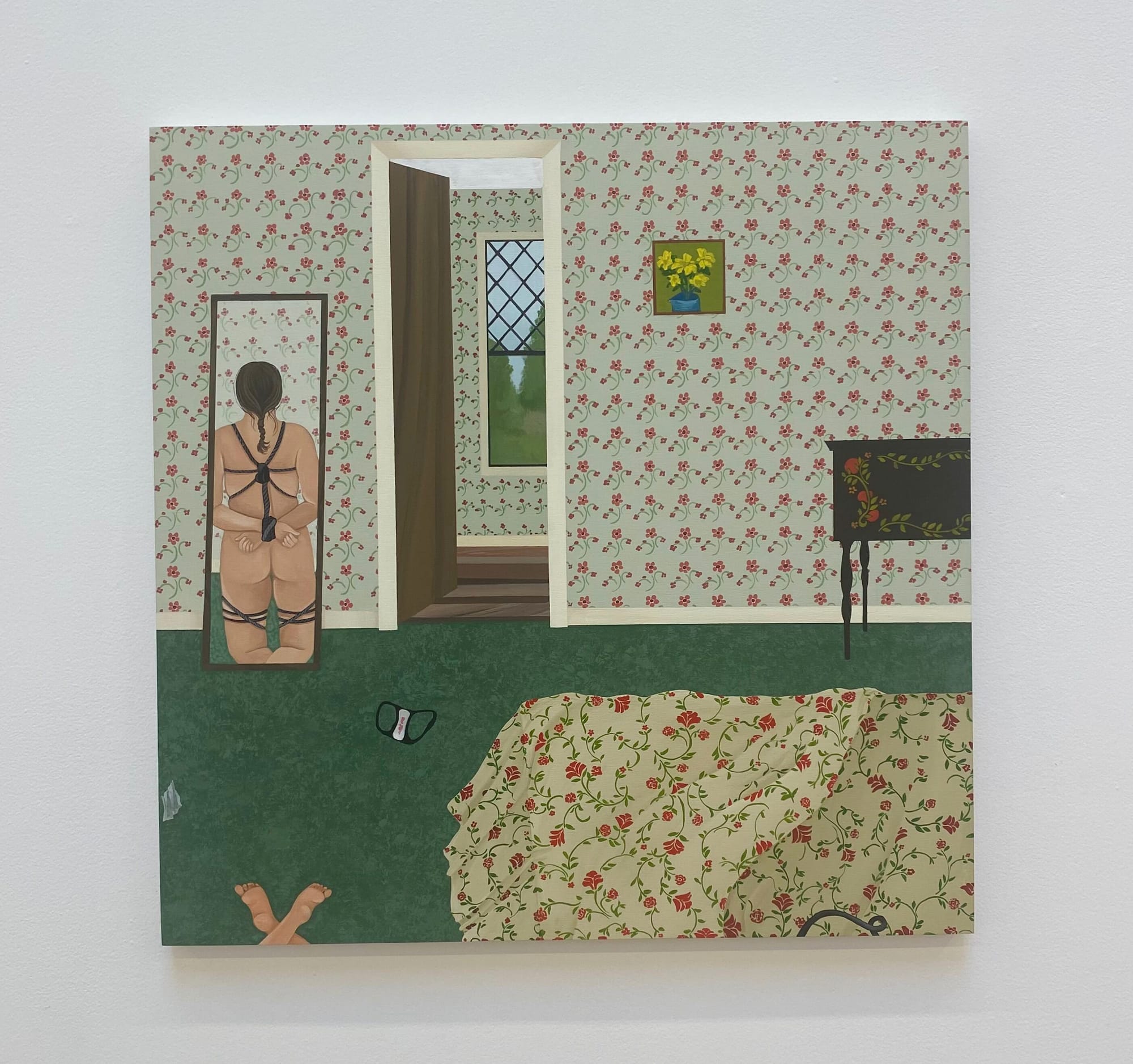 These items sometimes take the place of their users, or accompany people engaging in various sexually charged acts. In “Solitaire,” a figure is seen through a doorway sitting on all fours and looking back toward the viewer in anticipation. A game of solitaire on the table alludes to play, as well as the companionless subject awaiting a partner. A similar peek into a carnal scene appears in “Criss-Cross,” in which a kneeling woman bound with ropes is reflected in a mirror leaning on a wall covered in floral motifs. Her feet appear at the bottom of the composition, as if the viewer is standing next to her; a glimpse of a whip lies on the flower-patterned bed.