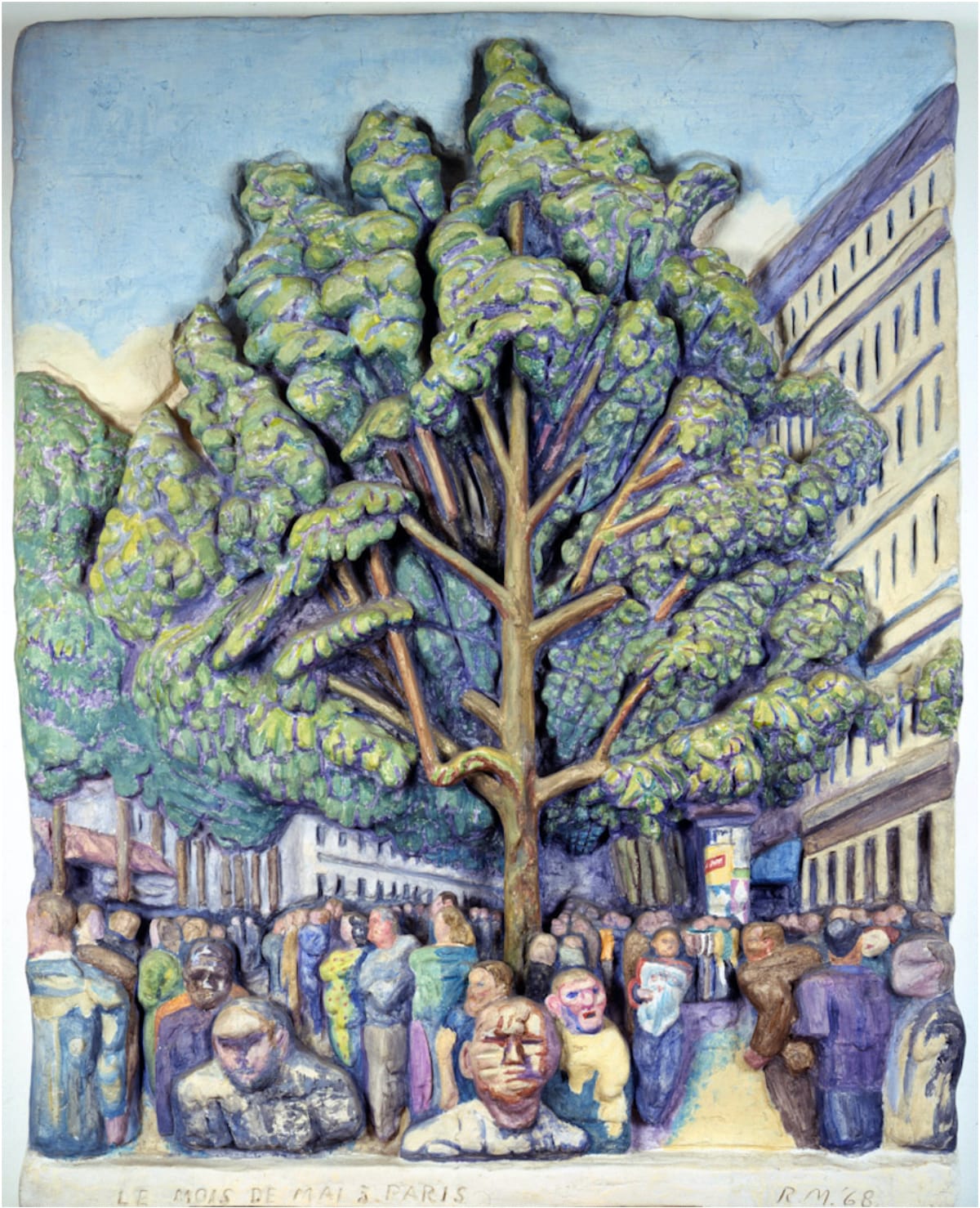 The exhibition includes Mason’s first bas relief, “Paris the Man in the Street” (1952), cast in bronze. A large, hollow-eyed man in the foreground rises up from the top edge of the bottom frame. Behind him is a receding space, and a row of building angling in diagonally. Urban despair and isolation are among Mason’s themes. As he got older, he moved away from angst-filled realism to caricature and cartoony exaggeration. He was a populist coming from the tradition of William Hogarth and social satire, a style of art that has never played well in the United States. (One exception is the 1976 installation and environment “Ruckus Manhattan,” a collaboration between Red Grooms and Mimi Gross.) The exhibition also includes the historically important polychrome bas relief “Month of May in Paris” (1968), in which Mason chronicles the first gathering of students that would lead to a general strike of more than 10 million workers, and the birth of the women’s liberation and gay rights movements.