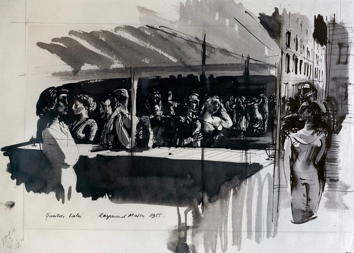The pairing of Harvey and Mason, each represented by 12 works here, is unexpected and smart. They were observational artists who moved from their respective countries, the United States and Great Britain, to Paris, where they became good friends. Relying on line and contour, both artists made inimitable, highly detailed ink drawings of everyday sights. Whereas Harvey rendered interiors, many with open windows, and examined surfaces and textures, often with a disquieting concentration of exhilaration and isolation, Mason was interested in crowds of workers, pedestrians, and strikers on the streets.