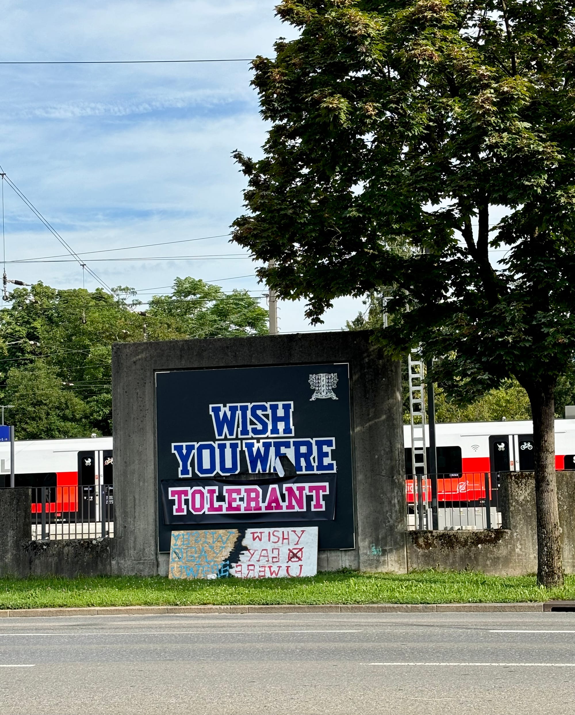 Currently, the damaged banners have been altered to read "Wish You Were Tolerant" in response to the attacks.