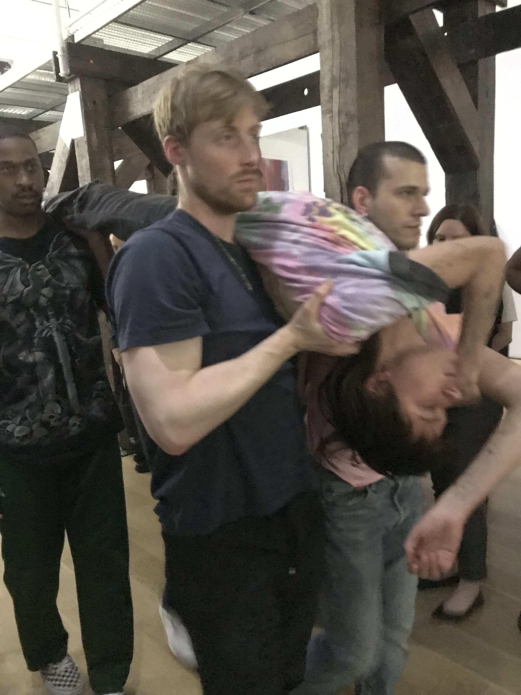 In fact, Sex is rife with action; there is hardly a dull moment. When one first enters, the performers are mostly still, reclining on mattresses or platforms distributed throughout the gallery, but things quickly start to heat up. At one point, several performers climb onto elevated structures and pour sugar out of boxes in streams that recall waterfalls. The image is surreal and elegant, material and meditative. In another striking moment, a performer stands atop the bier-like structure that runs the length of the gallery; several other performers gather below, steal their colleague away from the architecture and hoist the performer through the space like a crowd-surfer or a battering ram. This action is repeated several times. Each time, the procession travels slightly further, toward the opposite end of the room. The effect is startlingly dramatic — especially when coupled with spine-tinglingly haunting music.