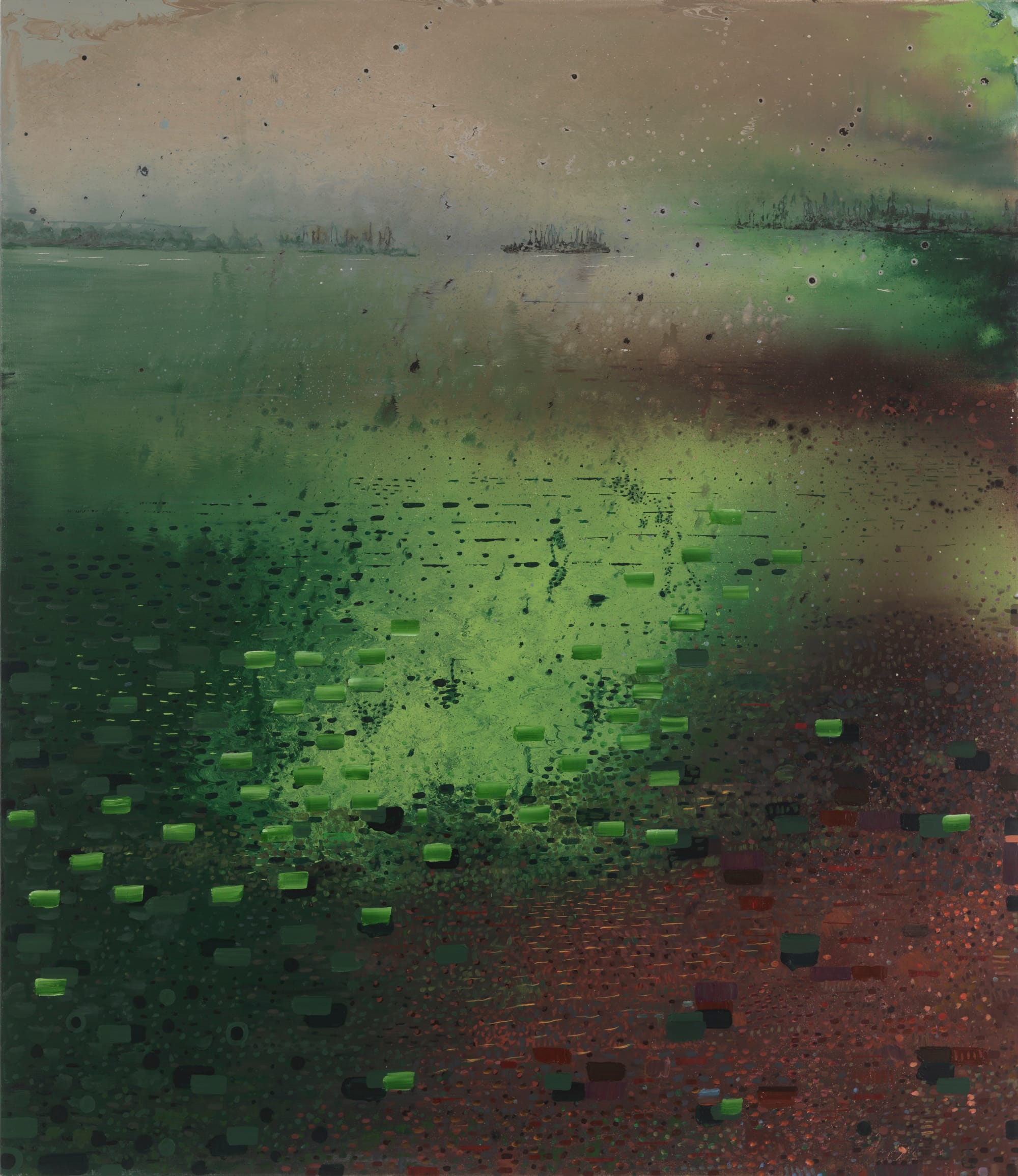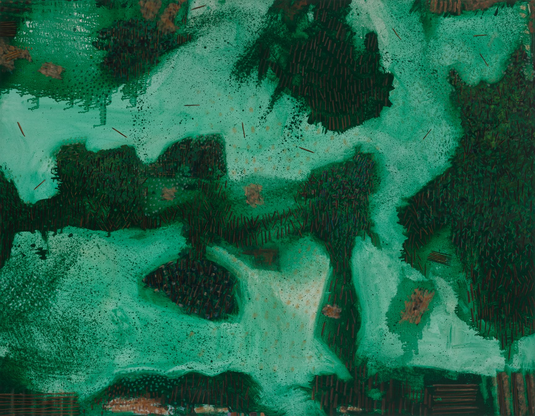 “Changes in the Land” (2019) takes its title from a book by William Cronon about the environmental shift in New England during the 1700s as European settlers gained dominance over the land. The painting is a response to the news that deforestation in the Amazon had reached a record high. “That information served as ballast as well a thread that led me into a visceral green pour consisting of washed green paint, then darker, more decisive forms,” Neely wrote me recently. The pour is “groundwork” for the subjective, she says: