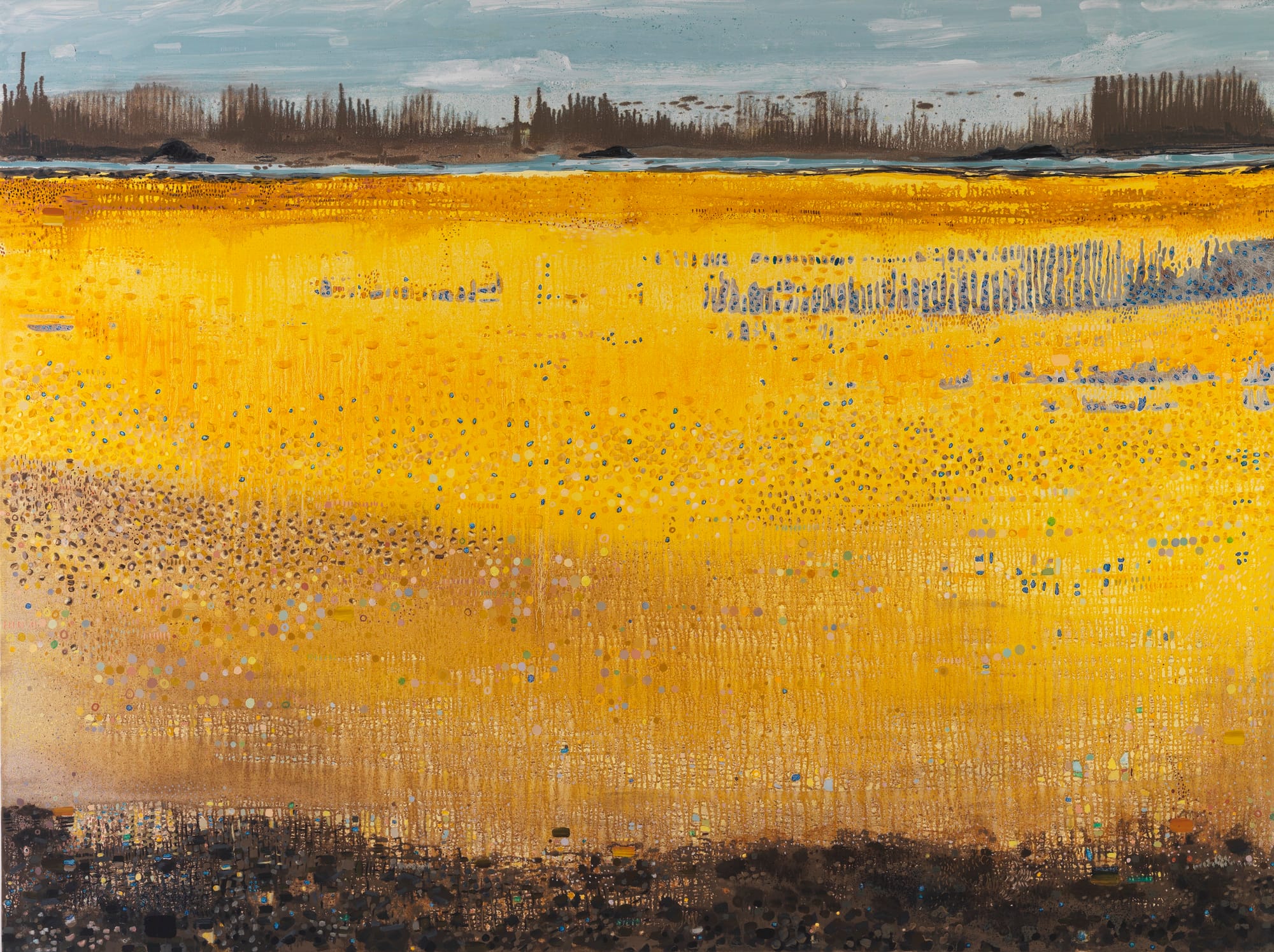 Once again, the painter built upon a poured foundation, sometimes adding visual elements that heighten her focus on what lies below the surface of the land. For example, in “Cahoosic” (2011), a narrow horizontal band composed of tree shapes near the top represents the world above while almost all of the rest of the canvas is a shimmering field of gold, the safeguarded subterranean aquifer flowing under rock, shale, and soil that here recalls, as critic Franklin Einspruch noted in a review of Mopang, a geological survey by Gustav Klimt.