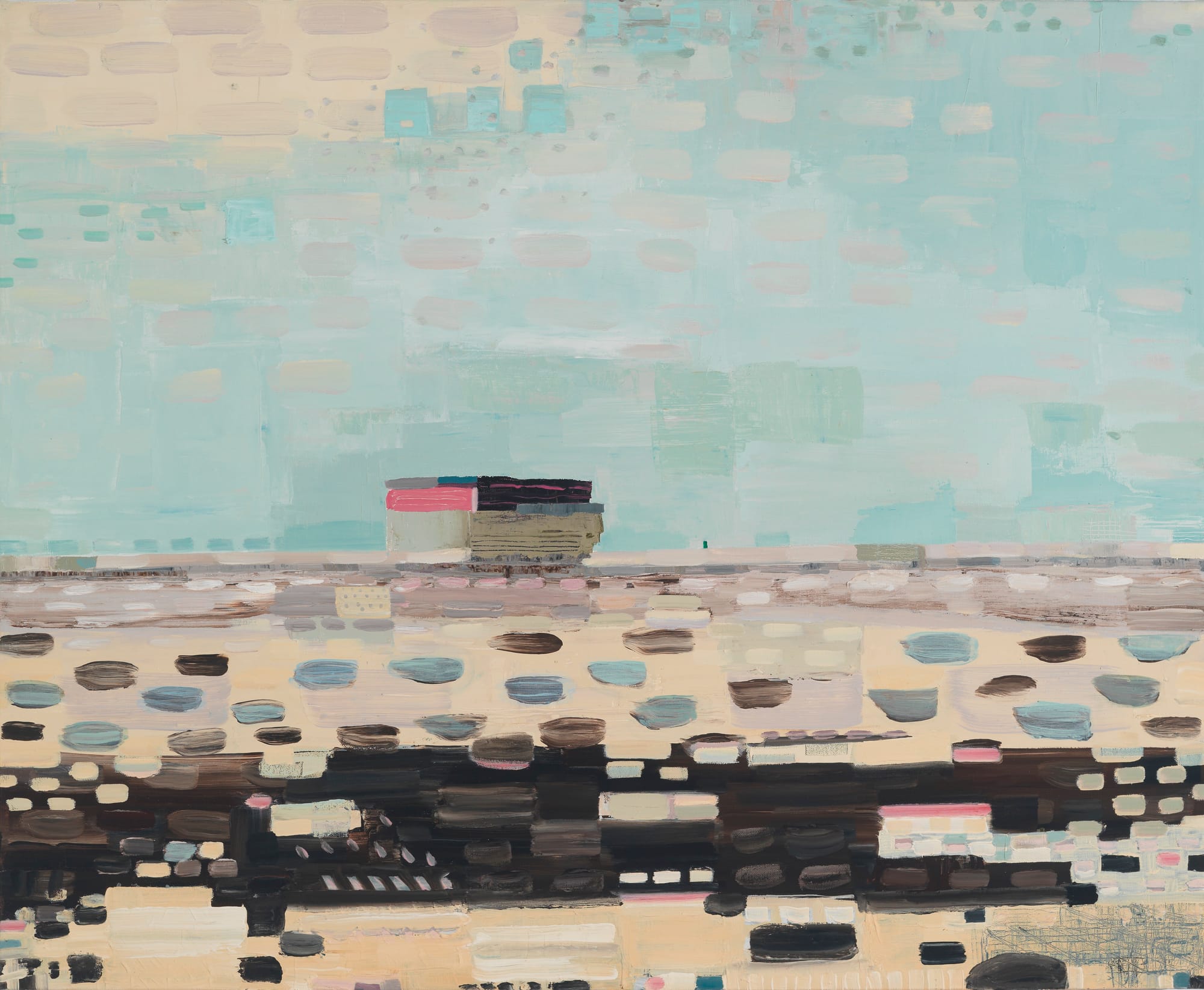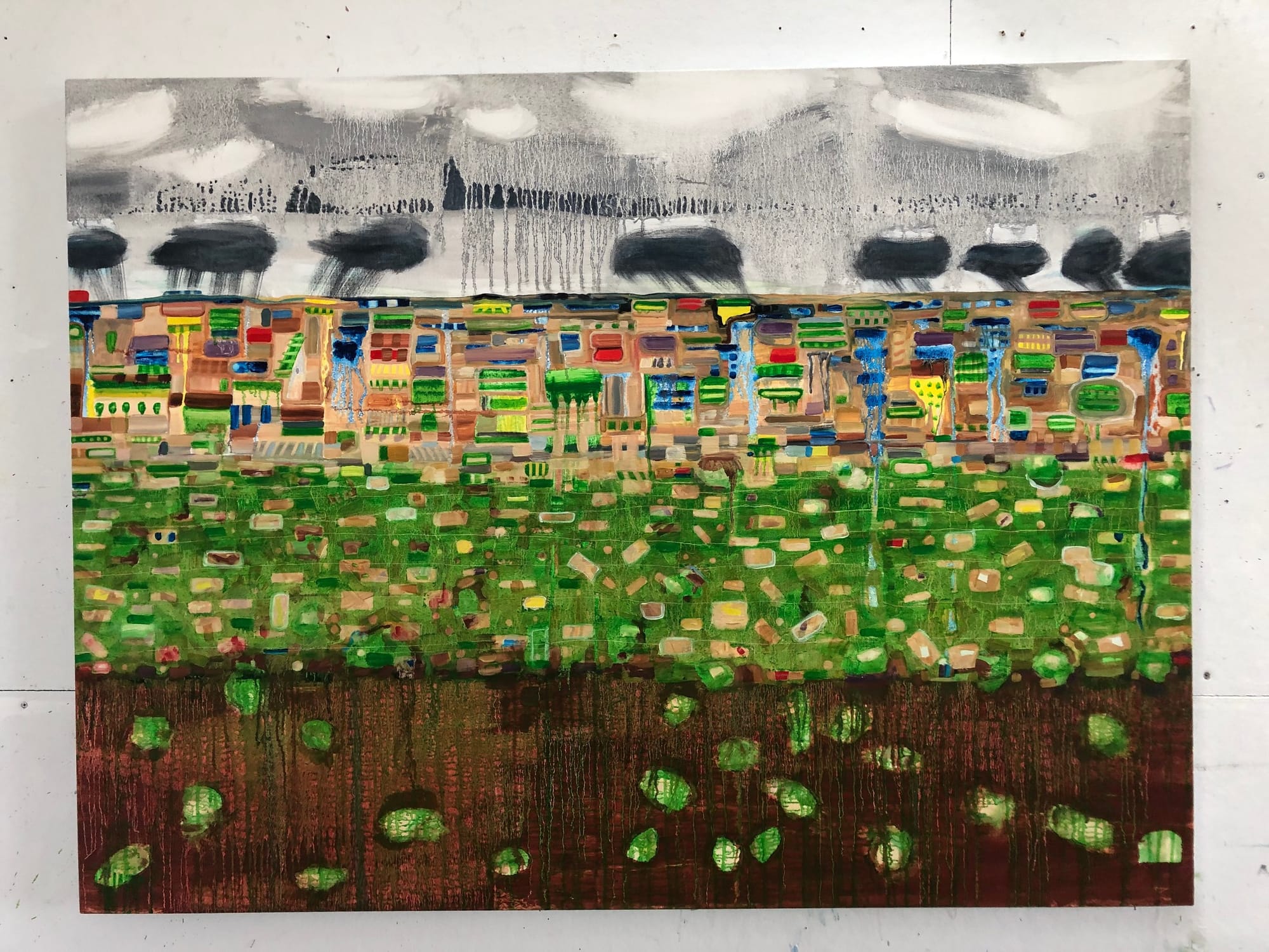 I emerge with the canvas covered, step back and, over time, let the painting find its own meaning. This painting became focused on the information and on mark-making, tinkering to clarify the intention of the painting, a tree here, piled lumber there. The patterning is set up to counter the vast washed emptiness, the sweat of trees, left behind.