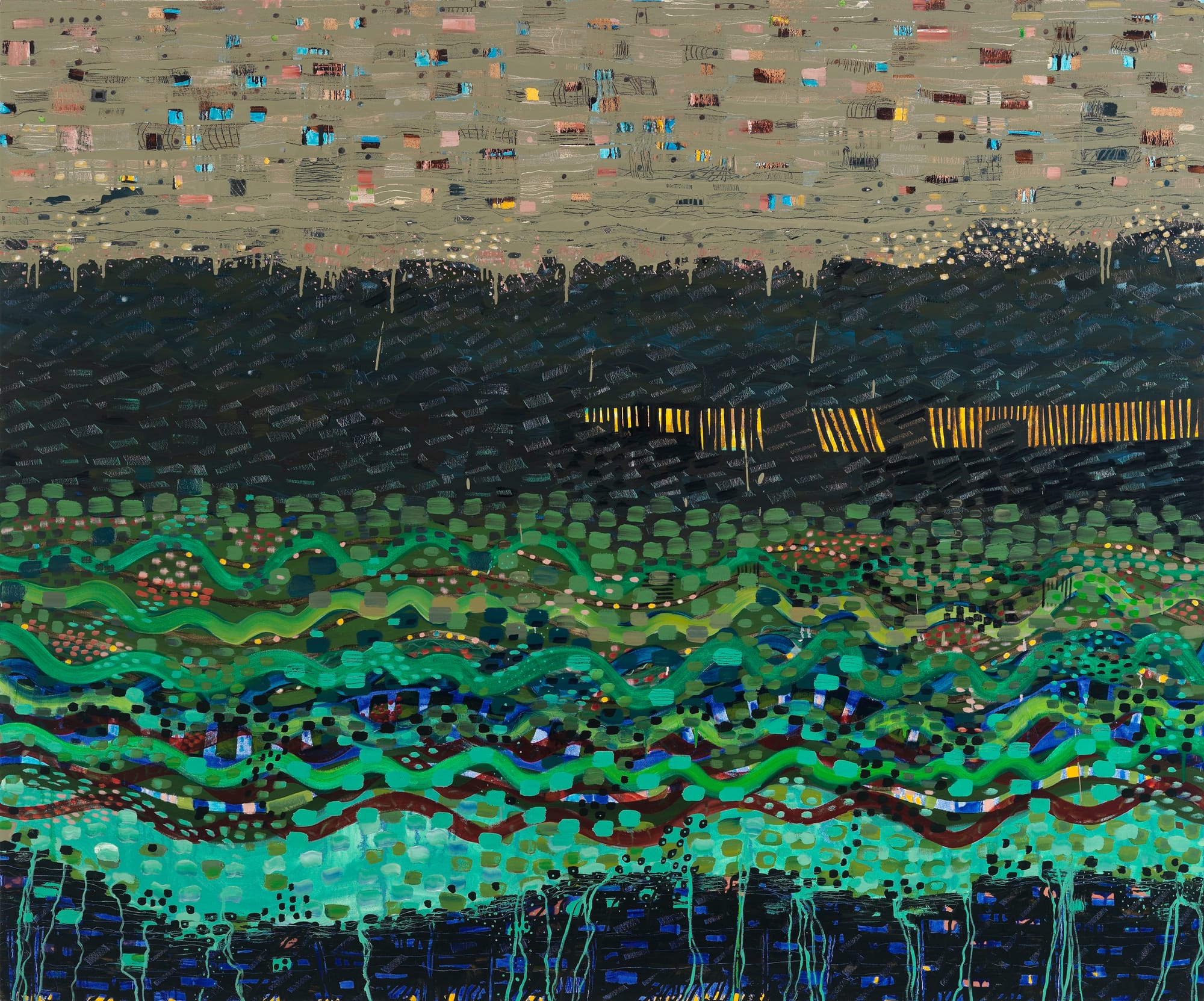 For the aforementioned show at the Boston Museum of Science, Neely upped the ante in her response to the devastation of water sources. The 14 large canvases, which were accompanied by Halsey Burgund’s soundscapes, had four broad themes with more specific references: mismanagement and overuse (damming of the Colorado River and depletion of the Ogallala Aquifer); contamination and pollution (the 2014 coal ash spill in the Dan River in Eden, North Carolina, and algae blooms in Lake Erie); climate change (Hurricane Sandy and melting glaciers in Alaska); and water mining (fracking the Marcellus Shale in Pennsylvania and tapping Maine’s spring waters).
