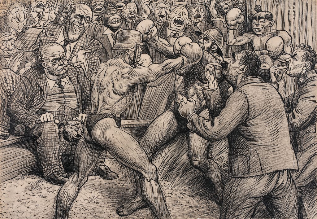 Smrekar’s commercial and caricature work took a more serious political turn after he met the Slovenian writer and poet Ivan Cankar, who became a creative collaborator and helped instill a strong sense of social justice. “Under Cankar’s outlook,” Simončič explained, “Smrekar began to develop a sharply critical tone which he then translated into caricature ... Both were very productive and keen on art that would exist without lies, flattering words, and hypocrisy, and that would have a clear stance on human values.” However, as seen in his 1941 drawing "Boxing" and other pieces, Smrekar's work does display the racist, sexist tropes of his day.