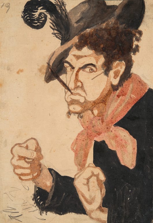 The artist was born in Ljubljana in 1883. Though his family was poor, Smrekar’s colorful, scrappy youth was a lasting inspiration. “He soaked up impressions like a sponge, and the characters he observed as a child found their way into his later art,” Simončič told Hyperallergic. The young artist grew up in the city center and was taken frequently to local taverns by his fun-loving father, where he met drunks, madams, itinerant actors, beggars, and other types. In school, Smrekar’s humorous sketches of his teachers won him friends, but also threats of expulsion. At university, he left his law degree to become an artist.