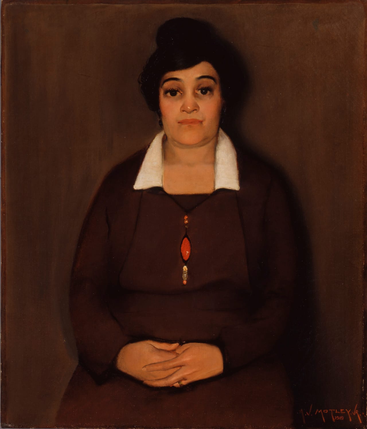 In “The Octoroon Girl” (1925), Motley depicts a self-assured, smartly dressed young woman who is defined as one-eighth black by descent. Her black dress and red hat, which are set against the deep russet-brown of the wallpaper, are seen in contrast to her light skin tones. Nearly a quarter of a century later, in “Portrait of a Cultured Lady” (1948), Motley depicts Edna Powell Gayle, an African American art dealer who represented him in her Chicago gallery, wearing a deeply saturated purple dress and red nail polish, sitting near fuchsia and lavender-colored flowers. Color is neither neutral nor purely optical, because we attach meanings to it, particularly when it appears in different contexts. Motley was acutely aware of this.