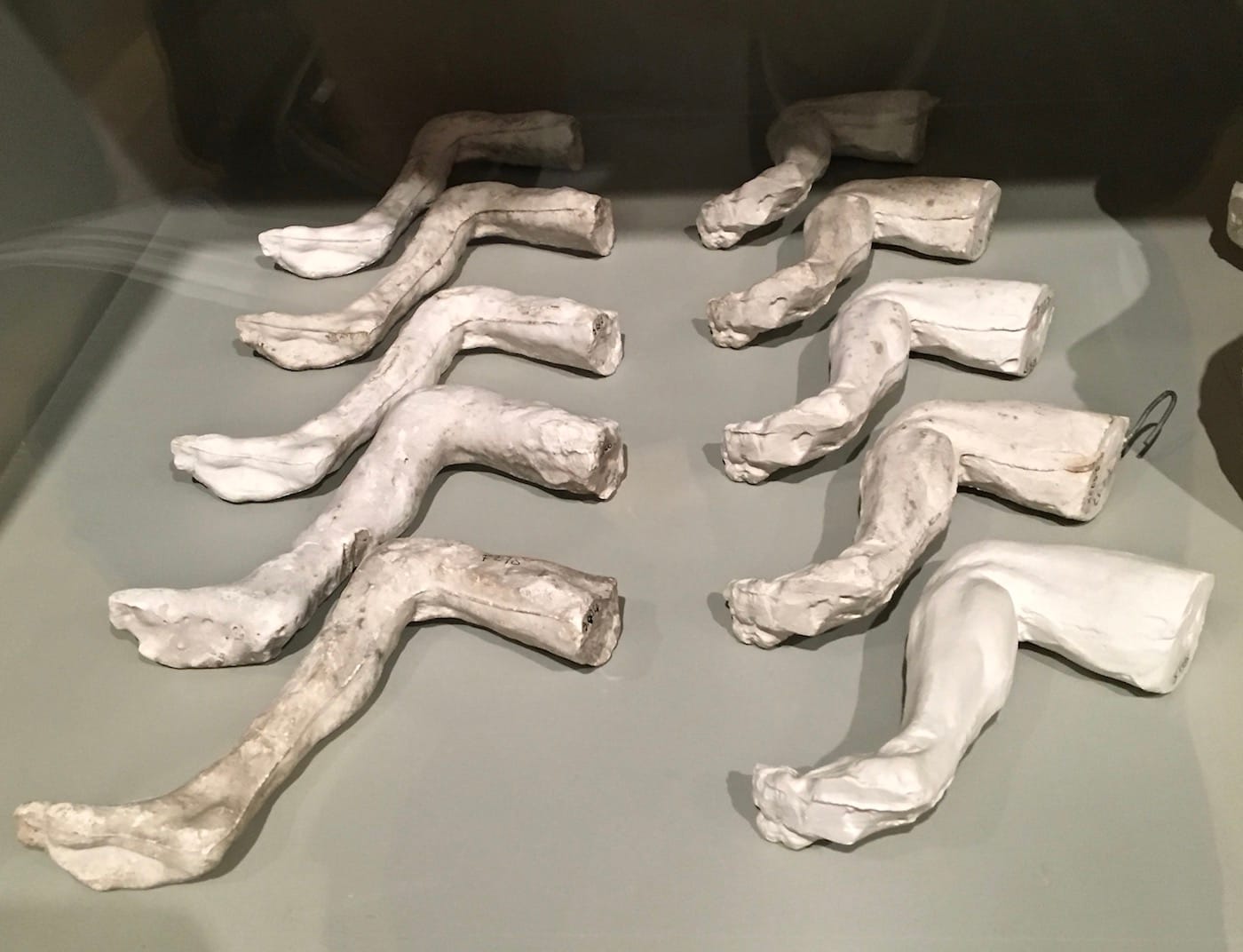 In other words, the Rodin found here is the not the French national symbol but the artist in his studio, a point driven home by numerous examples of his miniature plaster body fragments known as abattis — translated in the checklist as “spare parts” — consisting of variously sized arms, legs, hands, feet, and heads (on loan, as are all of the Rodins in the exhibition, from the Musée Rodin, Paris), which he would combine, cast, break apart, and recombine into new figures. Sometimes, the only difference between two casts would be the angle of a single finger on a disembodied hand.
