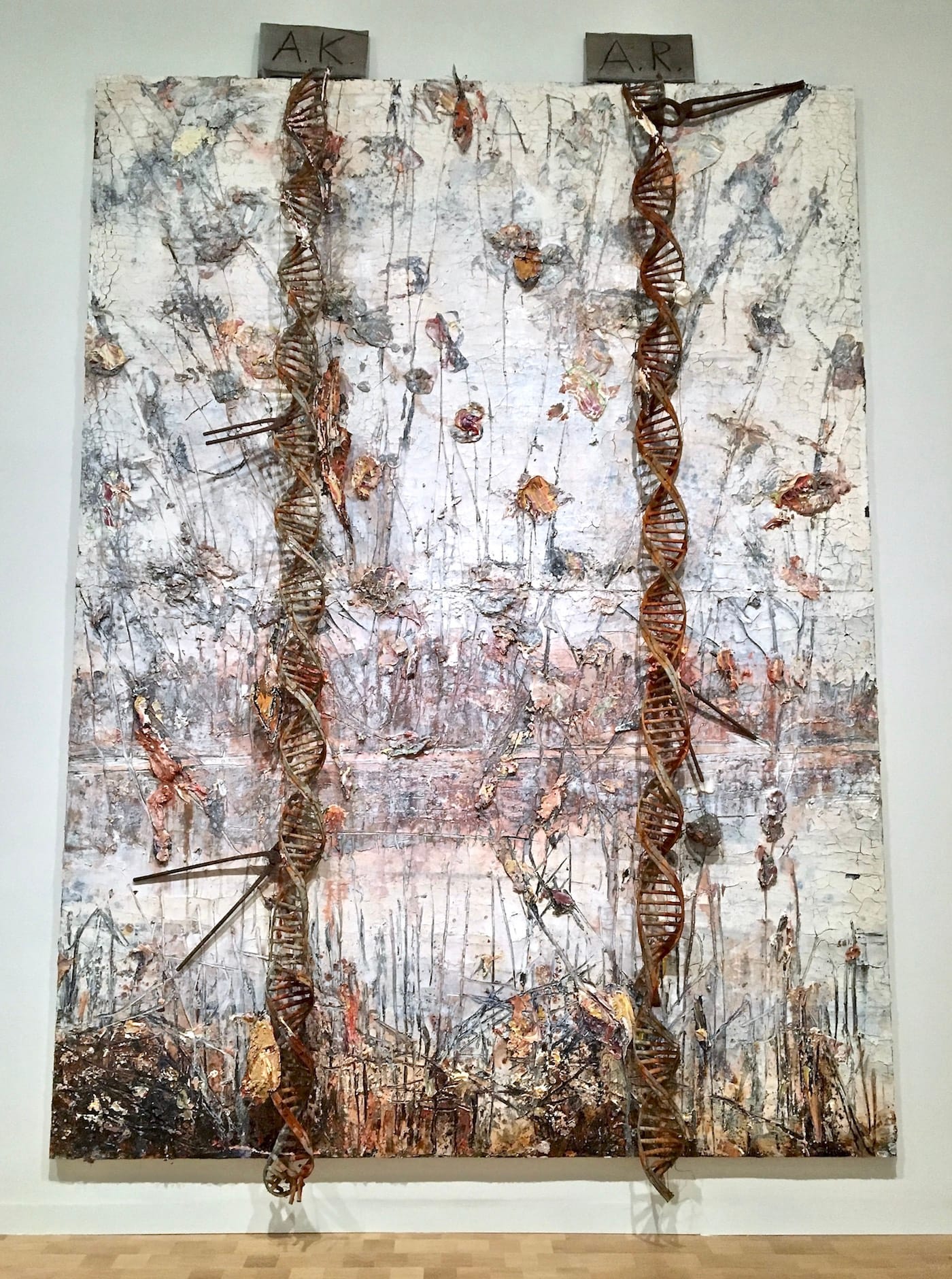 It is interesting to note that in “A.R. A.K.,” the canvas mentioned above, the initials “A.R.” appear not only on the metal plaque atop the DNA strand, but also incised into the surface of the paint; there is no second occurrence, however, of “A.K.”