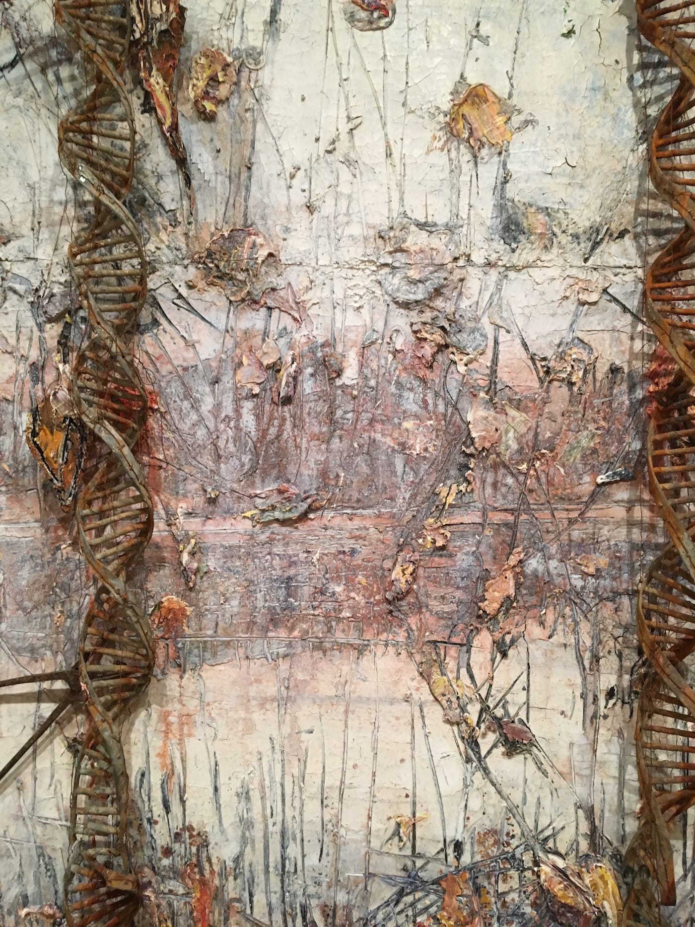 It is among the most materially engaging and formally transcendent works I’ve seen by Kiefer in a long while, filled with buoyant, almost Impressionist color that’s a far cry from the ash, carbon, and rust comprising the other paintings in the show, and anchored by two vertical metal double helixes, climbing like beanstalks from a few inches below the canvas to the very top.