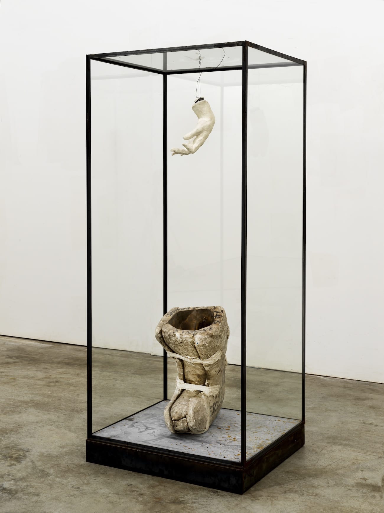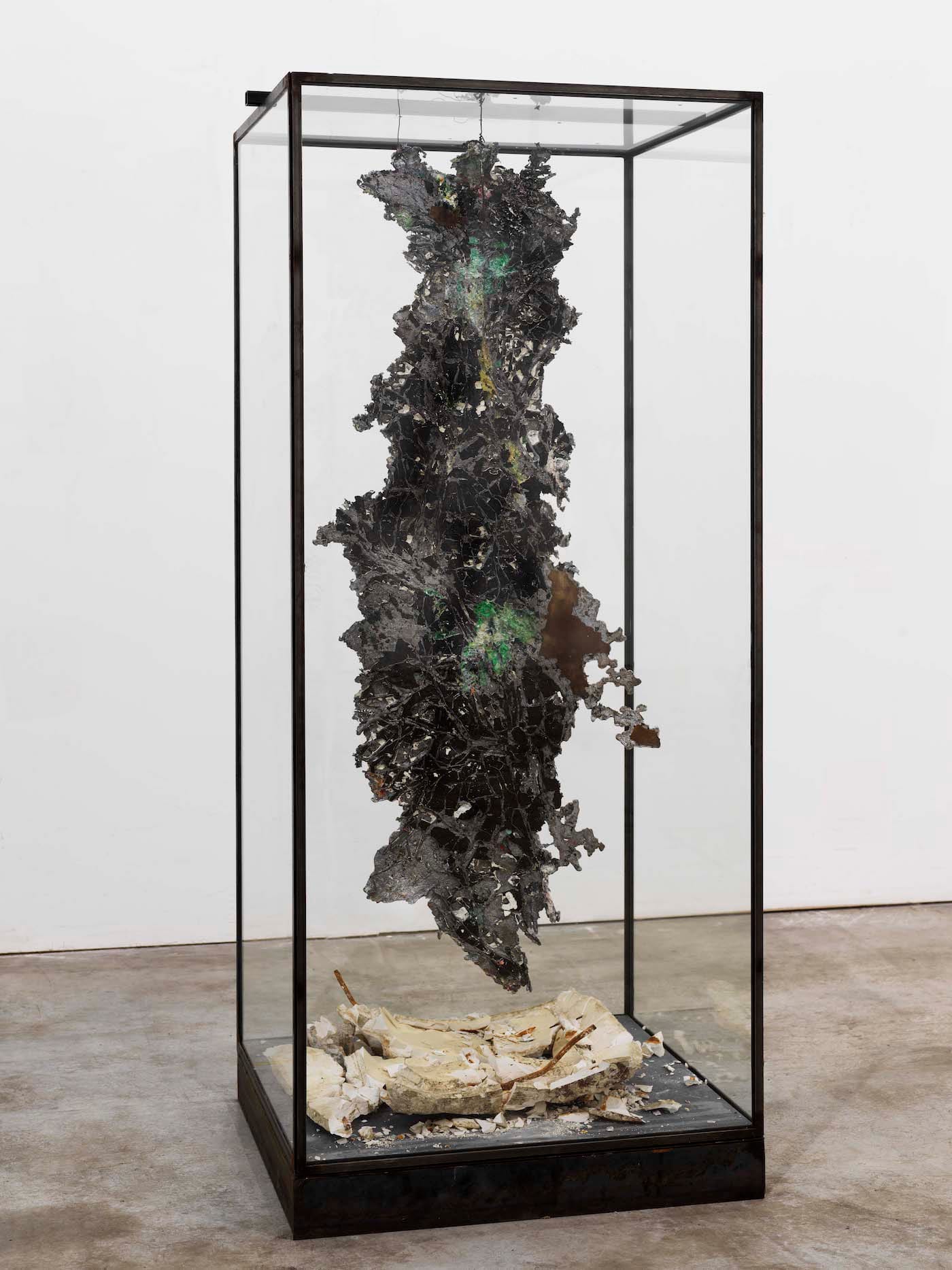 There are also two assemblages, “Dimanche des Rameaux” (“Palm Sunday”) and “Palmöl” (“Palm Oil,” both 2016), incorporating ghost-white palm fronds alluding to the Passion of Christ — the central Christian narrative of the destruction of the body and the release of the divine — and two that seem surprisingly topical, except that they were done last year, “Niederschlag” (“Fallout”) and “Emanation,” both of which feature an ominous cloud of molten lead. Many of these sculptures include antique plaster casts or shards of shattered plaster, bumping up yet again the theme of process.