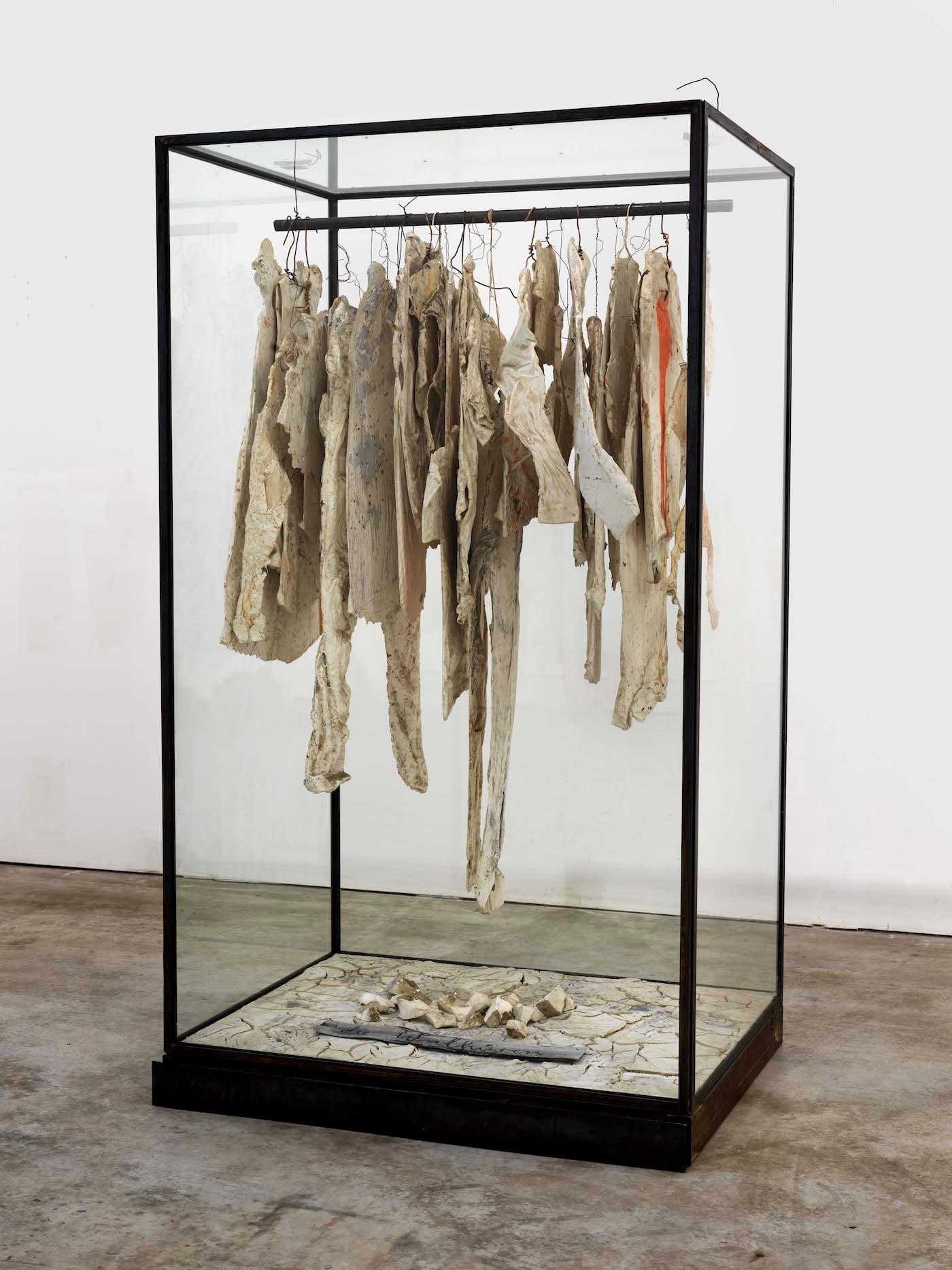 And he takes it in works that hew to prior motifs, such as “Danae” and “Die Walküren,” which consists of plaster-encrusted articles of clothing draped on hangers, and is perhaps, with its overtones of the Holocaust, the most emotionally affecting sculpture in the show.
