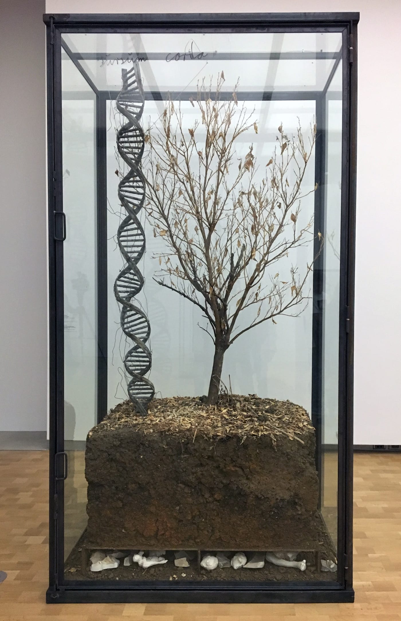 The double helixes are obviously meant to represent strands of DNA, which, combined with the metal slabs or plaques, unequivocally link Kiefer’s practice to Rodin’s — an unabashed display of ego that will undoubtedly rub a lot of people the wrong way. However, the double helix also appears in the sculpture “Sursum corda” (2017), where it is planted beside a dead tree in three feet of earth and reaches all the way to the top of its vitrine.