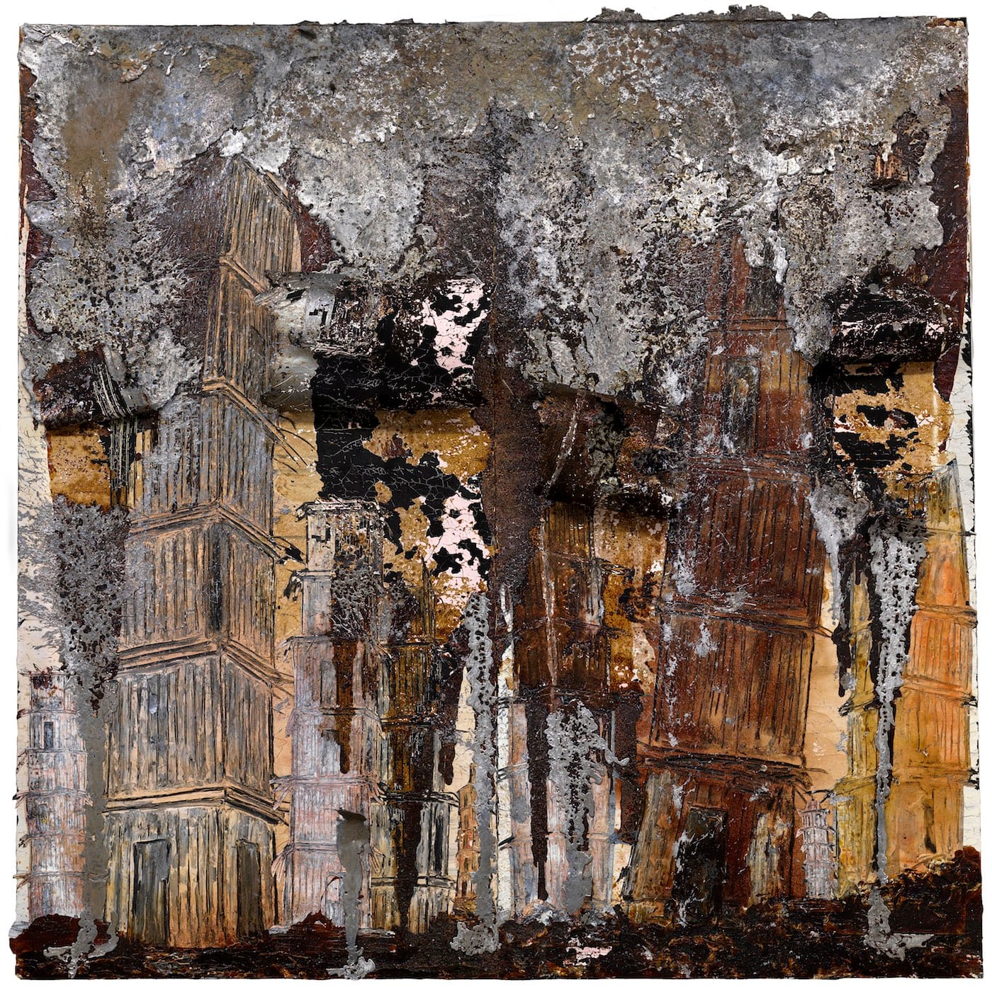 Kiefer takes this measure in ways that veer closely to Rodin — the revisiting of Les Cathédrales in plaster-covered books; the fresh versions of the abattis in “Sursum corda” and “Berthe au grand pied” (“Berthe Broadfoot,” 2016), the latter featuring a newly cast hand hanging from a wire; and the three large paintings in oil, acrylic, emulsion, shellac, and lead, all titled “Auguste Rodin: les Cathédrales de France” (2016), that depict the towers the artist built on his 200-acre studio complex near the southern French town of Barjac.