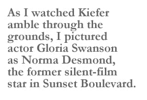 As I watched Kiefer amble through the grounds, I pictured actor Gloria Swanson, as Norma Desmond, the former silent-film star in Sunset Boulevard. Like Desmond, Kiefer spends most of his time honing his craft in a derelict compound, issuing instructions to his subordinates or muttering to himself. (“You see. This is my life! It always will be! Nothing else! Just us, the cameras, and those wonderful people out there in the dark!”)