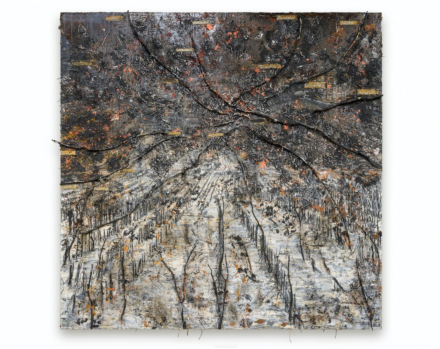 A German of the postwar era, he has wrestled, monumentally, with the long hangover of German guilt from the terrible misdemeanors of the past like none other. His colors and his textures show off, always, the nature and the quality of his sobriety. His paintings are giant, heroic blast sites — pitted, scarred, rough-textured, things that have been weathered in the worst possible conditions in order to test their mettle. Organic matter adheres to them – twigs and entire limbs of trees, for example.