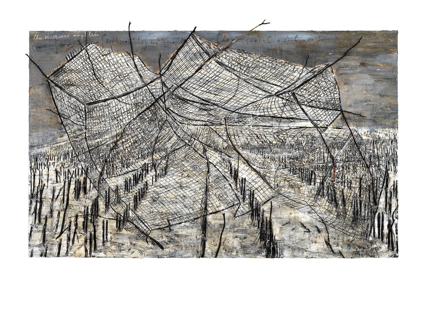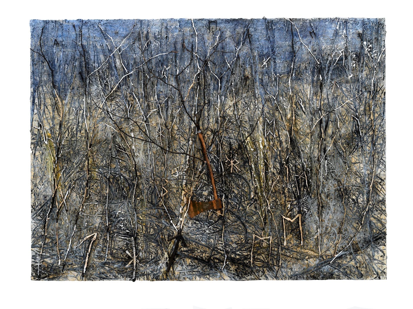 What is he adding today? Small bursts of color. A dowsing stick or two or three. A charred book. Scatterings of letters from that magical runic alphabet. Astrological symbols. Into several paintings he has incorporated netting, as if perhaps to suggest that the world, in all its impossible immensity, might yet be contained or containable… Into others he has embedded rusting axes.