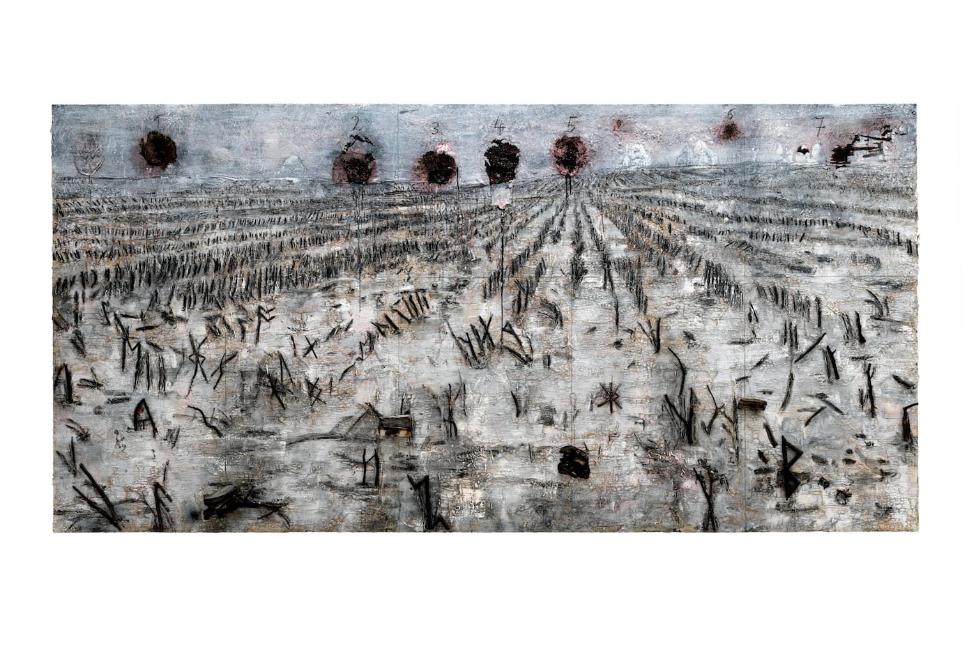 Many of the enormous paintings in these various galleries look very like the works that Keifer has created again and again in the past. We see landscapes stretching away to the horizon line, minglings of blacks and grays and whites, bleak exercises in perspectival drawing. The surfaces are rucked and blistered, victims of punishment — by war, by the elements, by the artist. He attaches things to the surface, and writes on it. He has always done that too.