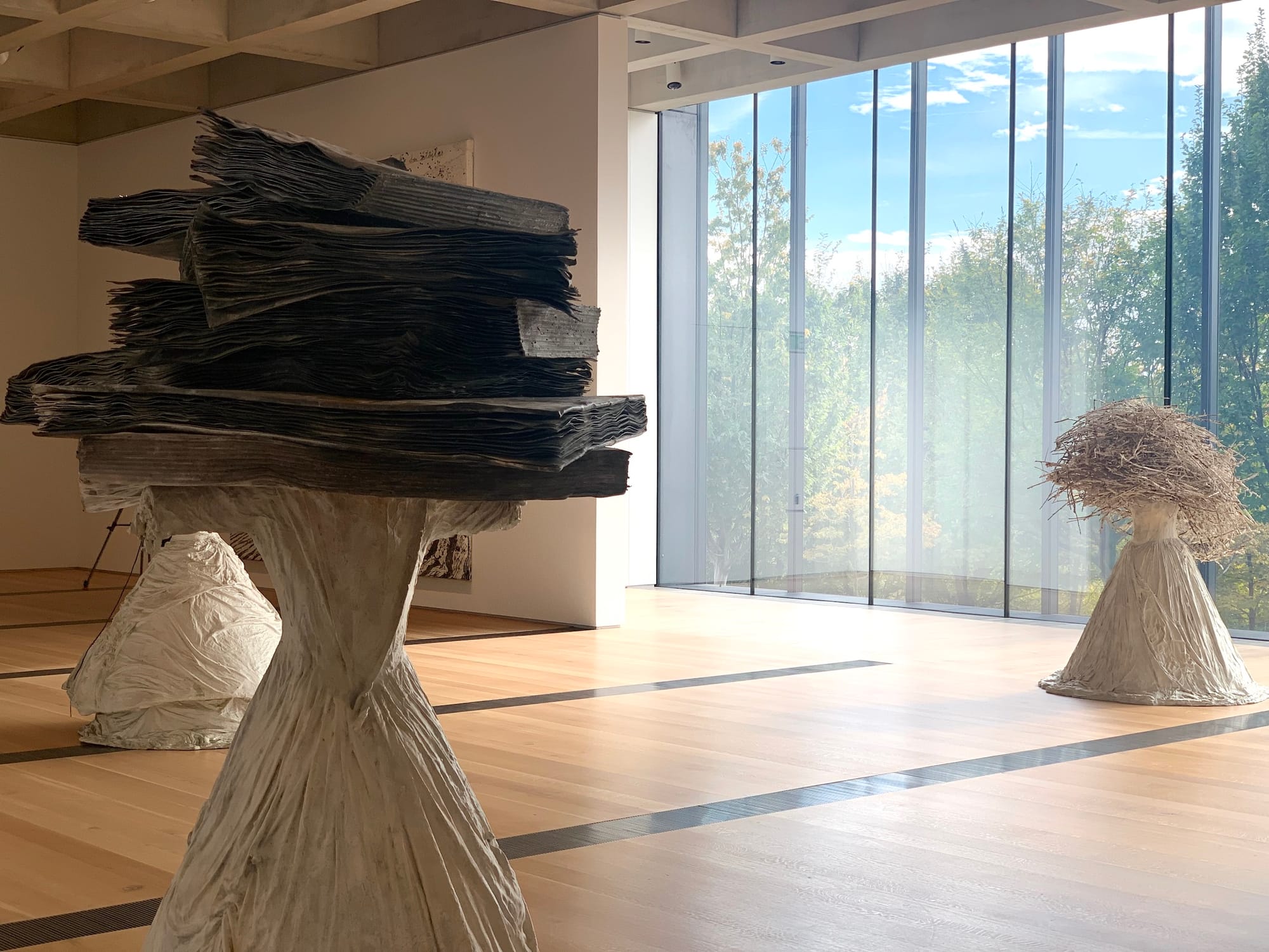 In the Weil Gallery, works from the sculpture series Die Frauen der Antike (The Women of Antiquity) (2018–25) catch the light from a wall-length window overlooking a row of trees. When the show opened, the greenery outside stood in stark contrast to the white gowns that compose the figures, each one representing a renowned female artist or martyr (Sappho, St. Eulalia, and Thusnelda among them); in winter, the dresses eerily align with the bare branches outside. In spaces like these, the art is in dialogue with Forest Park, the city’s crown jewel, where the museum is located.