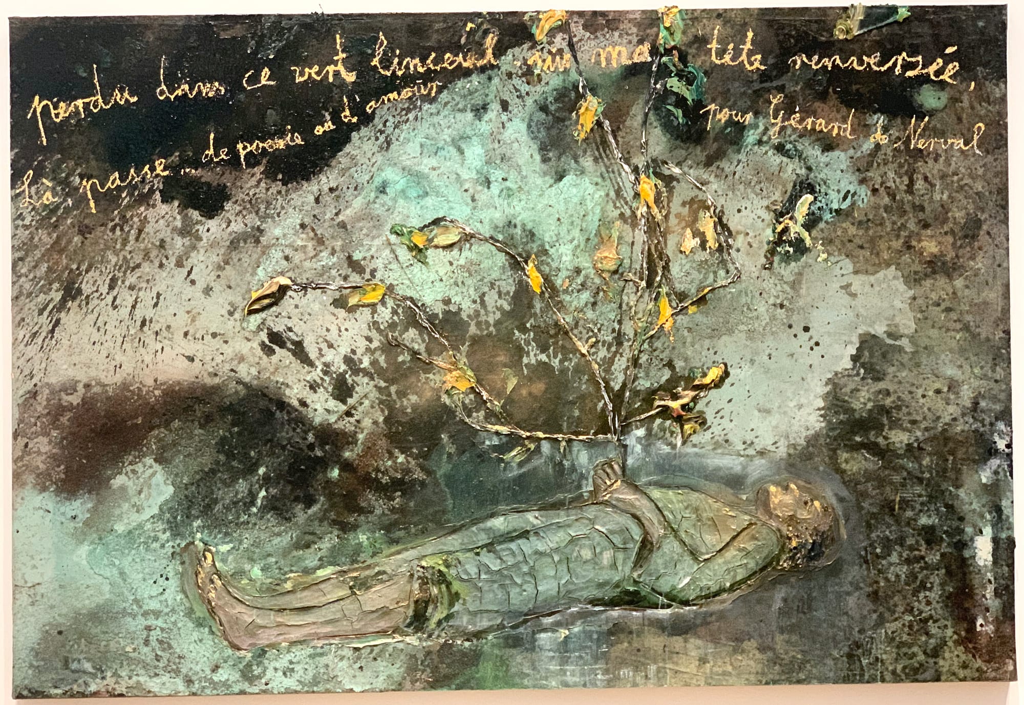 In the galleries of the museum’s East Building, where most of the exhibition is located, the deliciously tactile nature of Kiefer’s green-and-gold ensemble is more approachable and intimate. In “Der Rhine” (The Rhine, 2024), the Black Forest’s thick branches form a fine brocade over the river, the leaves leaping from the surface like tongues of fire. On the opposite wall, “Dans ce vert linceul” (In This Green Shroud) (2024), which quotes lines of poetry from French Romanticist Gérard de Nerval, depicts a man lying on the ground holding a tall bouquet of yellow-petaled twigs. Donning the signature nightshirt of Kiefer’s earlier self-portraits, the supine figure appears at once relaxed and wondrous, a gesture perhaps to a oneness with nature as our own mortality approaches.