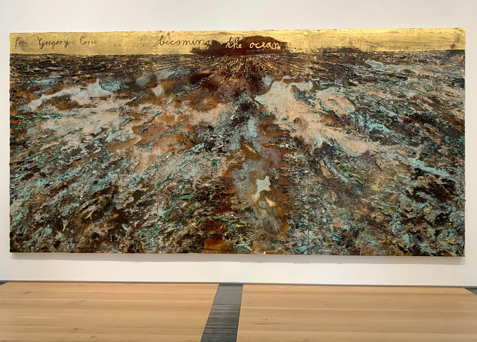 Becoming the Sea is a sublime instance of Kiefer’s inveterate (some might say shameless) Romanticism. Nostalgia for the Rhine River of his childhood flows into homages to the Mississippi as a symbol of both industry and creative freedom; the feminine spirits of the Indigenous North American Anishinaabe and Wabanaki people ebb into a reference to the “Rhinemaidens” of the Wagner opera cycle Der Ring des Nibelungen (The Ring of the Nibelung); tributes to German-Jewish poet Paul Celan splash against those of American Beat poet Gregory Corso, to whom the show owes its title. Philosophers and mythological figures loom within a visual language that convolutes cultural distinction within a Kiefer-verse of singular awe. Uniting much of his recent work is a palette of refulgent gold and aquamarine, the murky browns of the “muddy” Mississippi exalted as glittering spectacle.