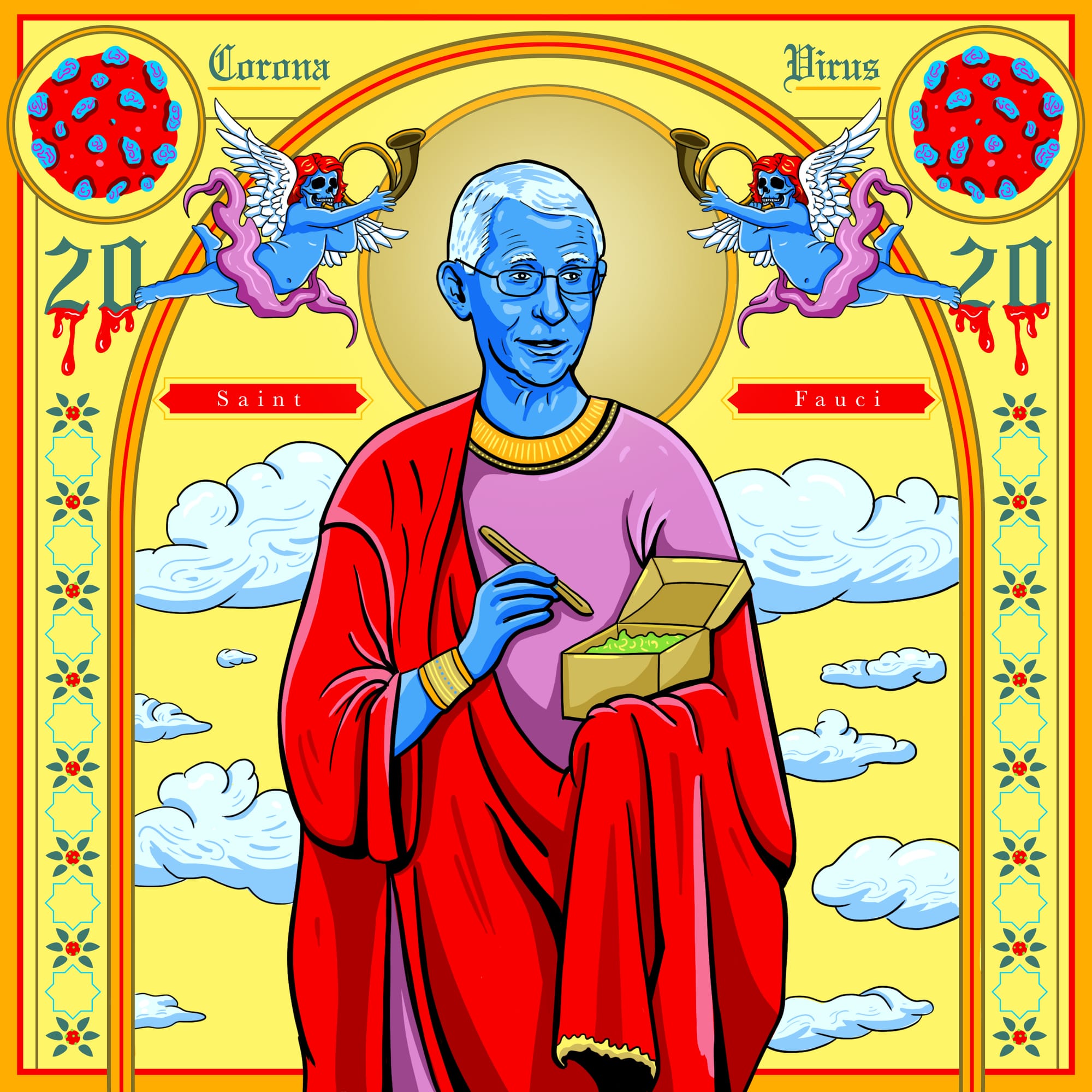 One of the most intricate tributes to Fauci belongs to Andy Andersen, an illustrator based outside of Los Angeles. His illustration depicts the famed doctor as the late-medieval Saint Pantaleon the healer. “Saint Fauci” holds a box of medicine, flanked by angels of death and spikey coronaviruses.