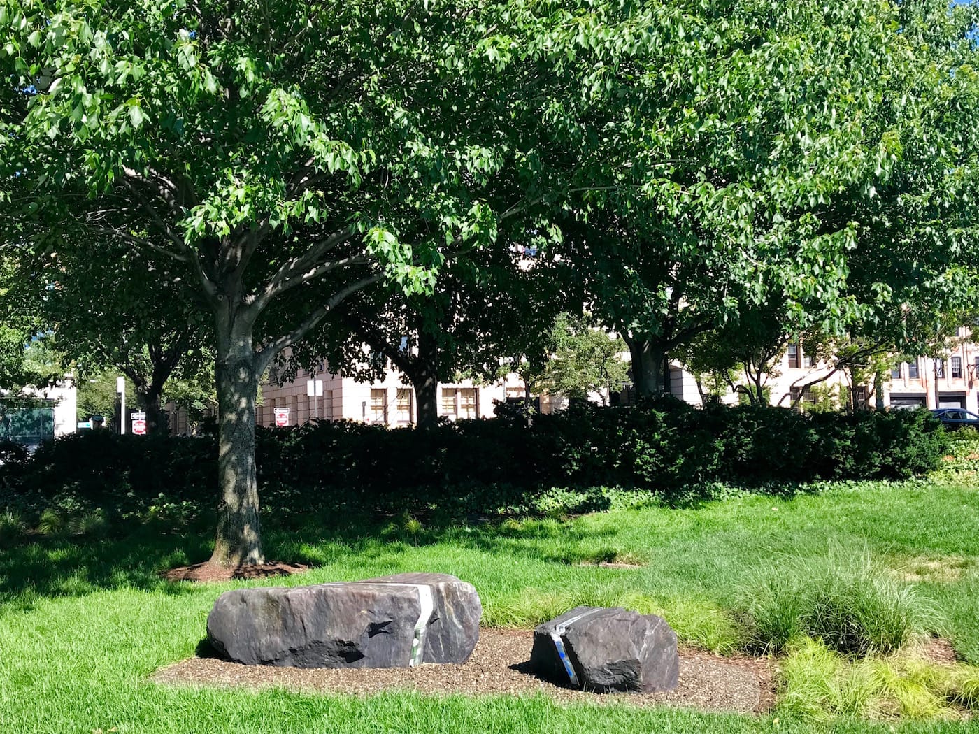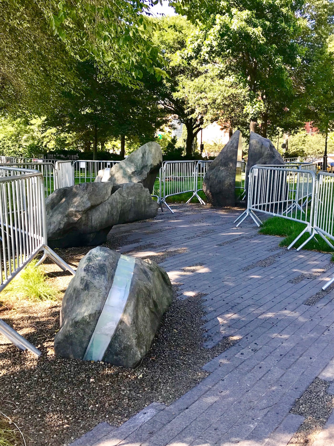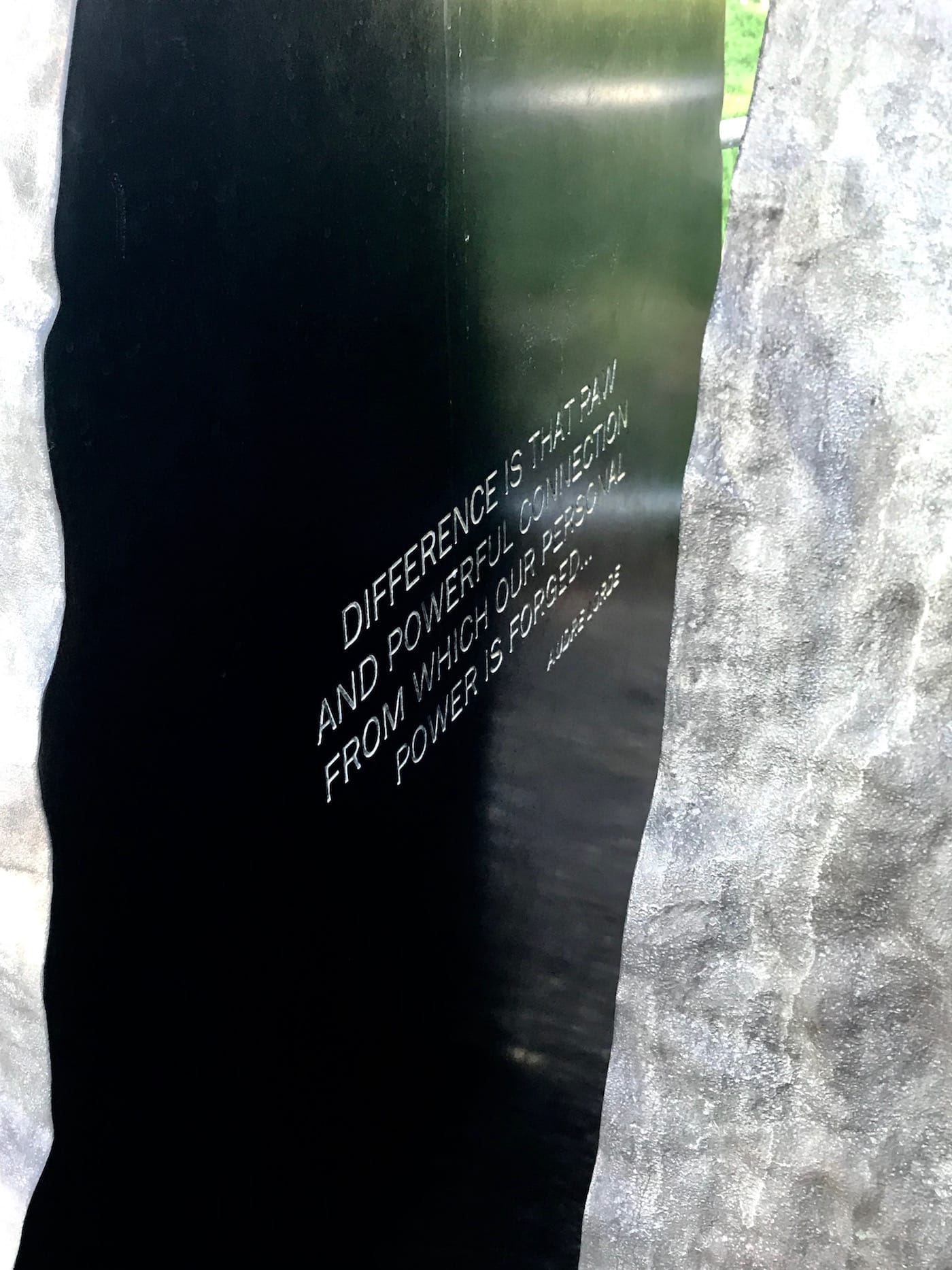 Another difference between the mock-up and the final product is the existence of a stone pathway to the memorial from the sidewalk, bathed in a still-sticky resin. (On the day I visited, most of the park was still fenced off by temporary barriers, which actually separate two of the memorial boulders from the rest.) Following the pathway, which interrupts the circular structure of the memorial, leaders will reach the largest boulder. Split in half without a glass strip binding the rock together, the boulder’s inside contains two impactful quotes from Audre Lorde: “Difference is that raw and powerful connection from which our personal power is forged,” and “Without community there is no liberation … But community must not mean a shedding of our difference.”