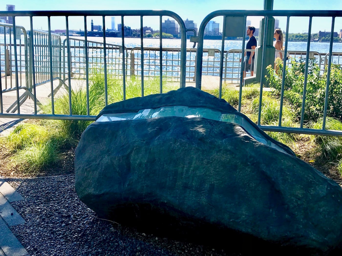 Anthony Goicolea’s LGBTQ Memorial in Hudson River Park consists of a circle of nine large boulders that evoke the image of an impromptu meeting space. Although these boulders look like conventional rocks, they are actually made of bronze in an effort to subvert the expectations of the artist’s materials — what you see is not necessarily what you get. Within eight of these boulders, Goicolea has inserted a strip of reflective glass that refracts various colors emanating from the rocks’ cores.