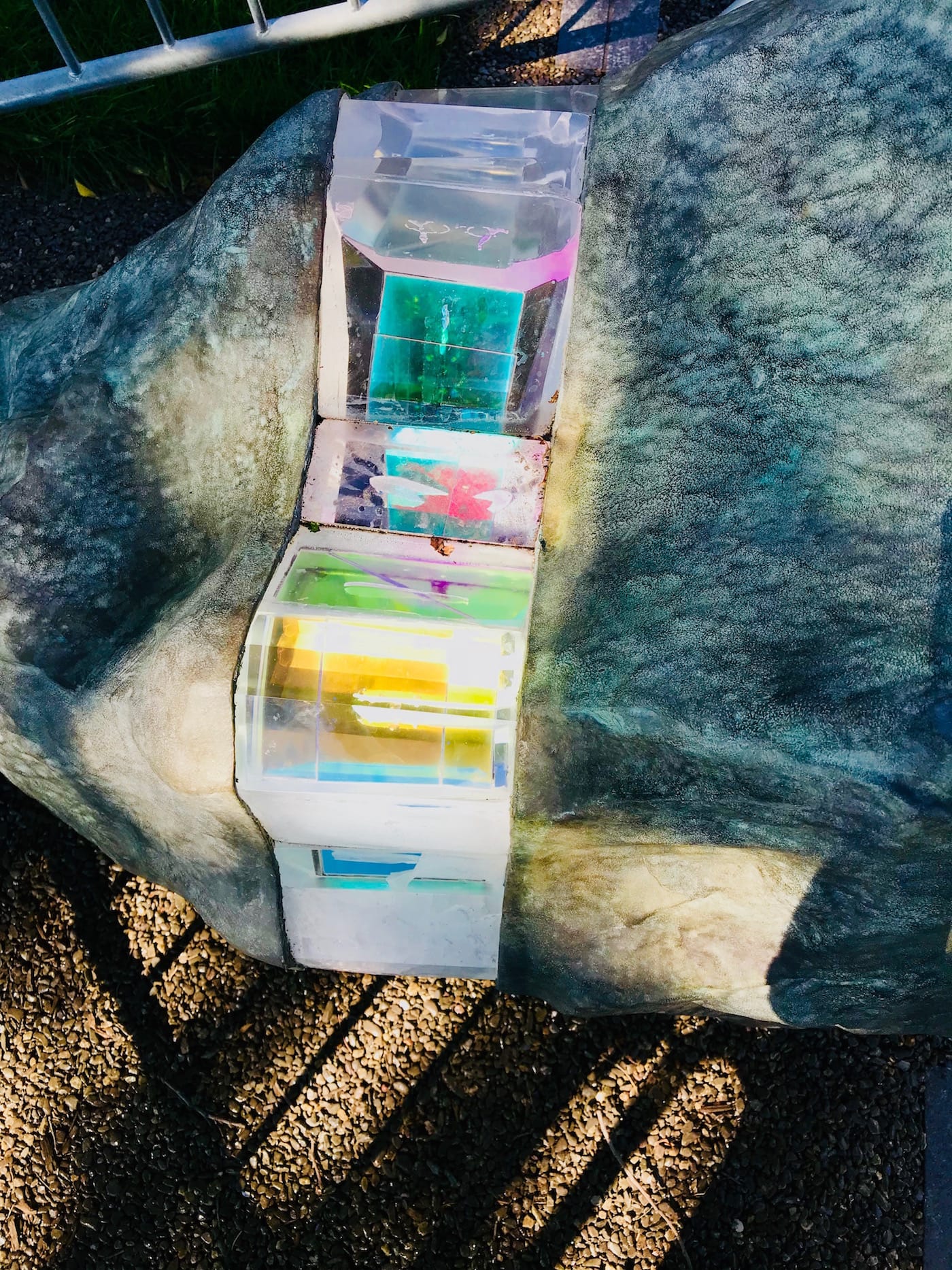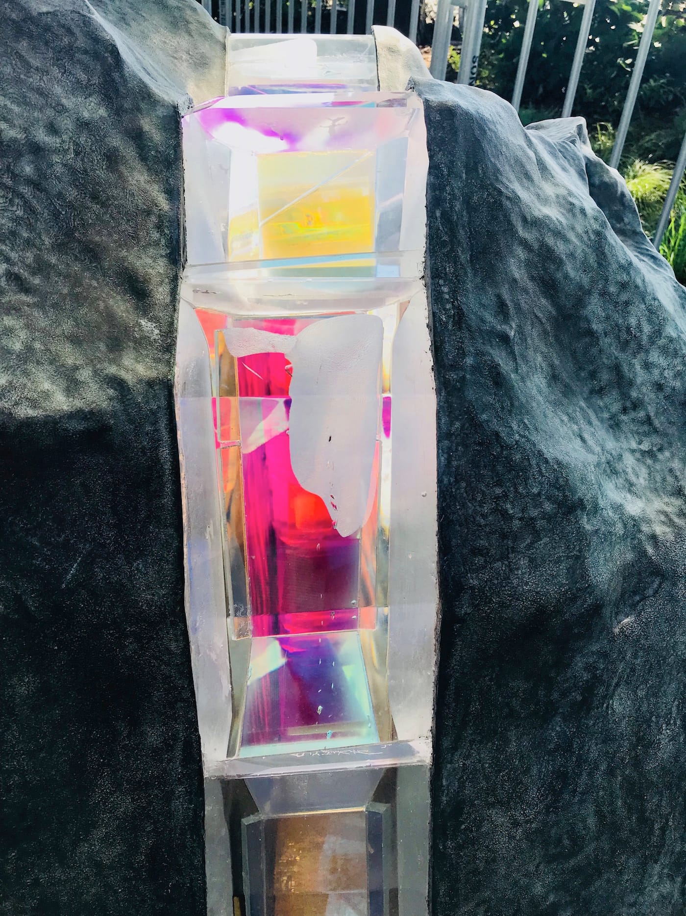 In an interview with Hyperallergic last year about the monument, Goicolea described the prisms hidden within his boulders as refracting light in different ways depending on the season, day, weather conditions, and perspective. The finished product looks more finalized than fluxed. Visiting the park in the early evening, the reflective rainbow materials under the glass strips did less glowing from inside the rocks than merely signpost a rainbow light. Admittedly, the result is muted when compared to Goicolea’s original concept.