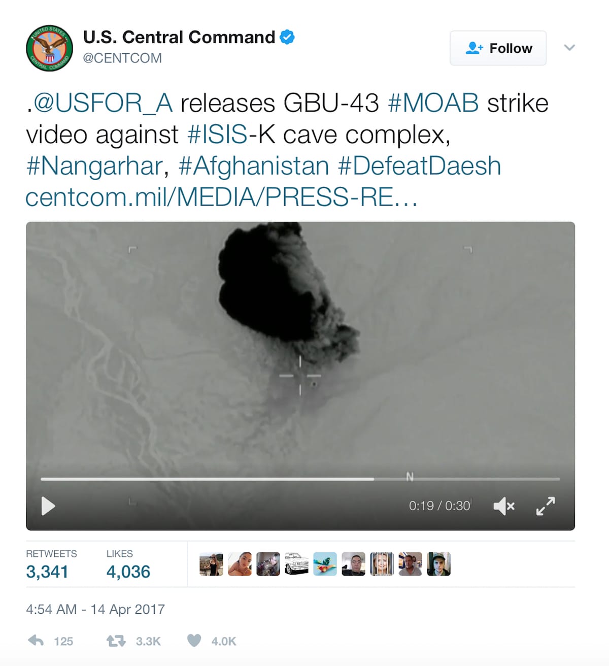 On April 14, 2017, at 4:54 am, US Central Command tweeted a 30-second video of the bomb drop and explosion. The black-and-white military recording begins with an aerial view of mountains, valleys, and bodies of water, their contours defined in a subtle range of grays. About four seconds in, an object falls rapidly from the sky, hitting the ground hard. A massive explosion racks the image on the screen, sucking all the grays out of the picture. Everything turns a bright white save the detonation and plume of giant smoke. The remaining part of the video tracks the black mass moving beautifully up out of the frame, becoming lighter in color the farther it rises.