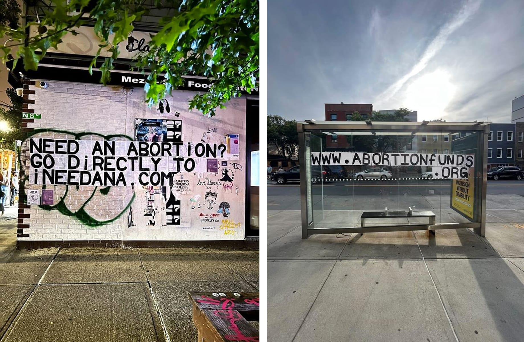 Many online resources link to donation forms for national organizations, but arts collectives have also partnered with local groups. For example, Feminist Collages NYC collaborated with the DIY collective Fund Abortion Not Police on monochromatic wall murals across the five boroughs. The large-scale text pieces promote Plan C, Mail Aid Access, and ineedana.com, with messages claiming “Your right to abortion doesn’t come from the state, it can only be limited by the state” and “Aid and abet abortion, we will not comply.”