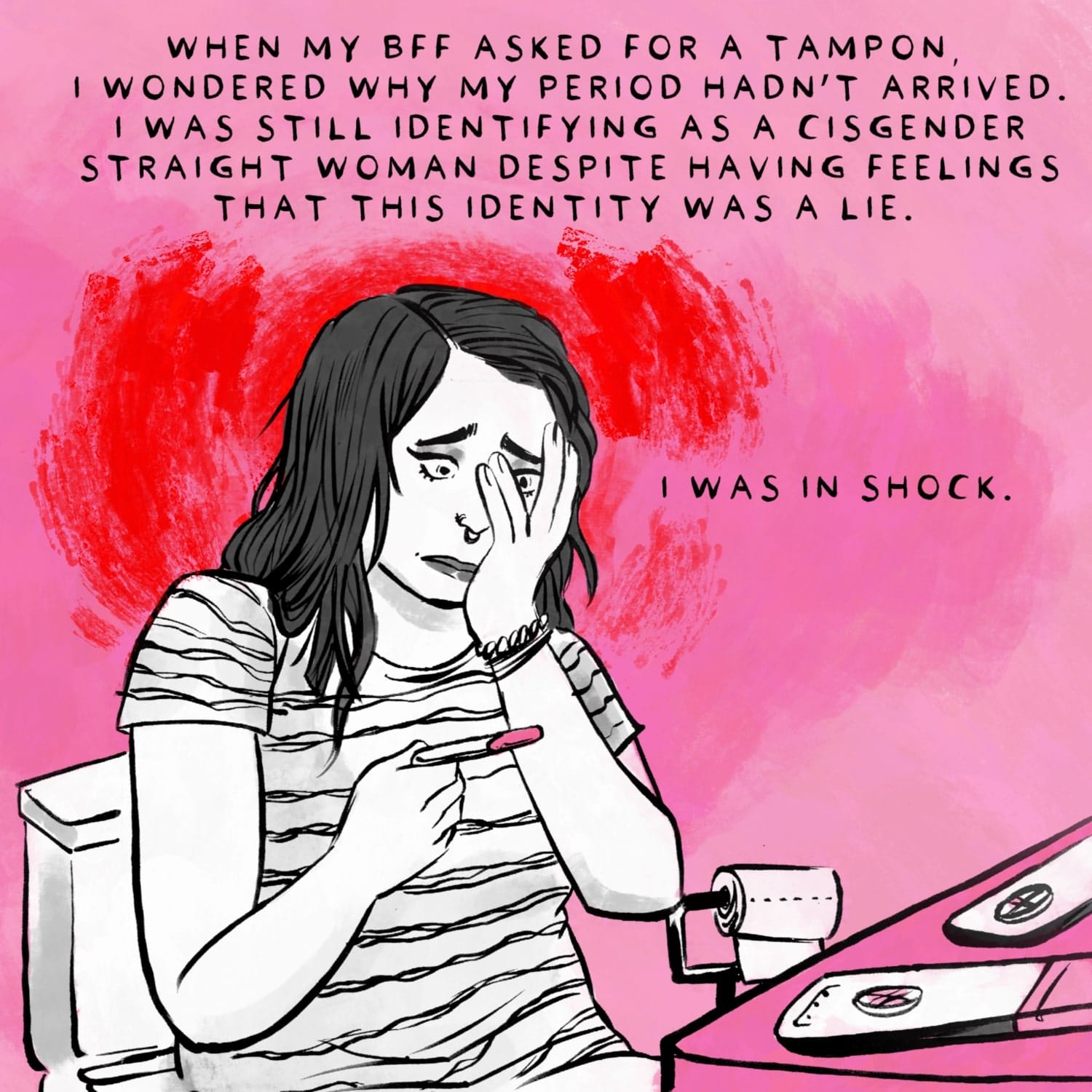 Free comics by We Testify, an organization dedicated to abortion storytellers, detail personal testimonies of self-managed abortions. One comic, "Transition" by Sage Coffey, relays a transmasculine nonbinary person's experience with an unexpected pregnancy, which occurred before their coming out. Rendered in shades of the transgender flag, Coffey's work describes failed methods of self-induced miscarriage, such as parsley, tea, and Plan B (one panel includes a disclaimer that the morning-after pill does not cause abortions) before seeking help from the greater community, which quickly comes to their aid. The final panels show how the treatment helped them affirm their gender identity, concluding with the phrase, "Everyone loves someone who had an abortion."