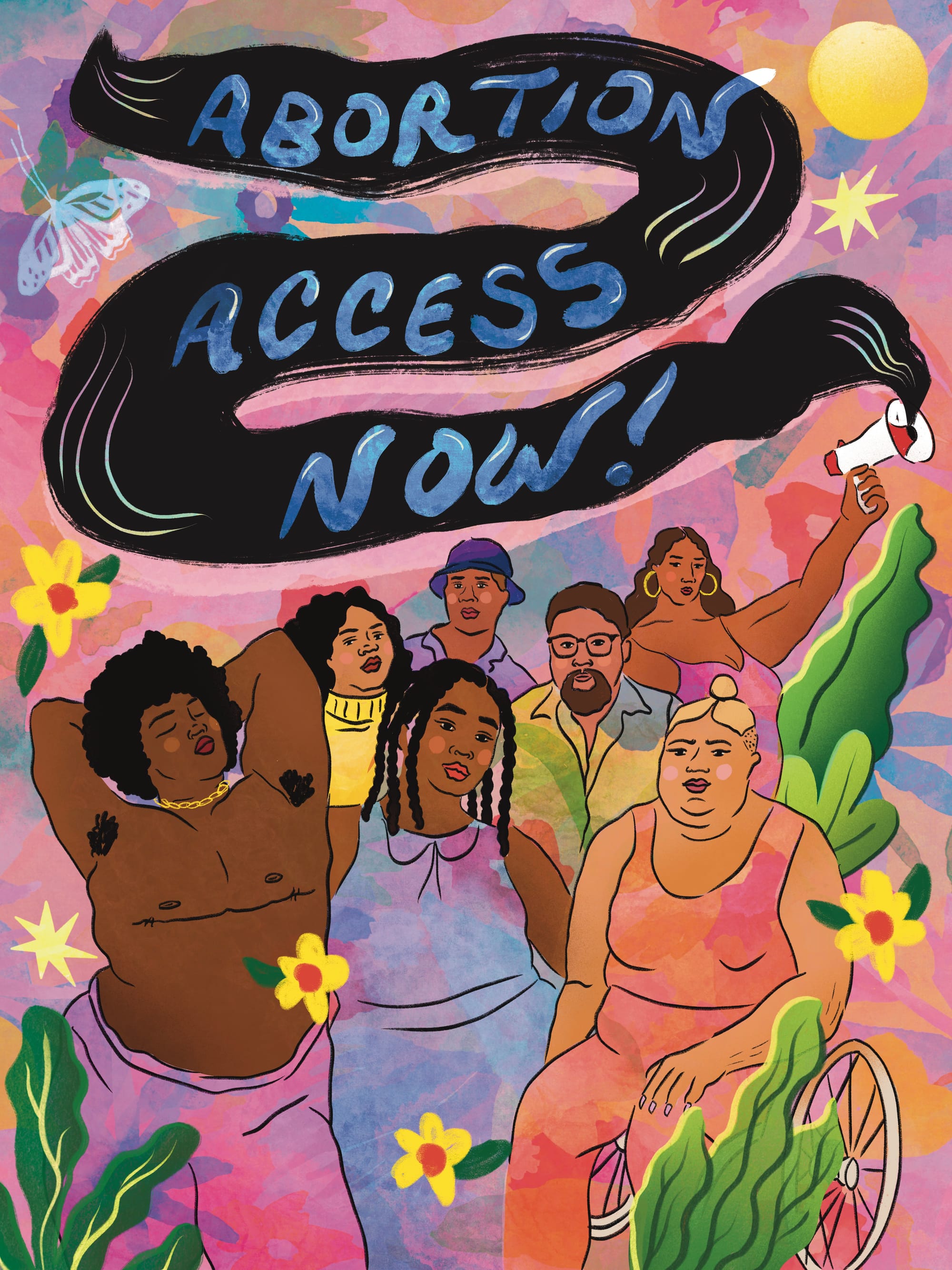 Other organizations are working against the spread of anti-abortion propaganda. The Center for Cultural Power, for example, is uplifting sex-positive artworks by Nina Yagual, Angelica Frausto, and Elizabeth Blancas, among others. Spirited graphic designs portray queer people of color standing together and link to local organizations like SisterSong, California Latinas4RJ, and the Afiya Center. The Center’s latest animated video, “Some Reflections on Abortion,” interweaves interviews with Aimee Arrambide of Avow Texas and Amanda Beatriz Williams of Lilith Fund with footage from protests over the last few months, speaking to the growing coalition between artists and activist groups.