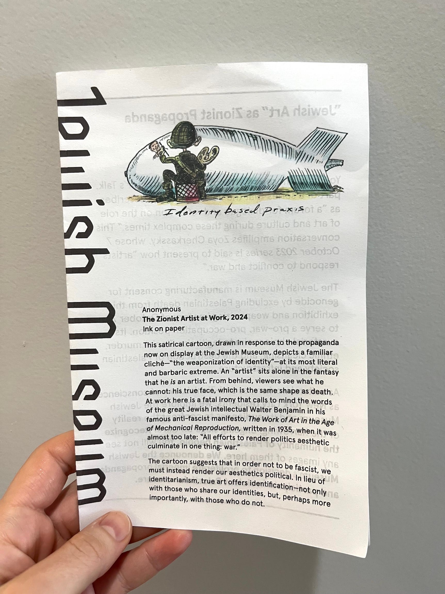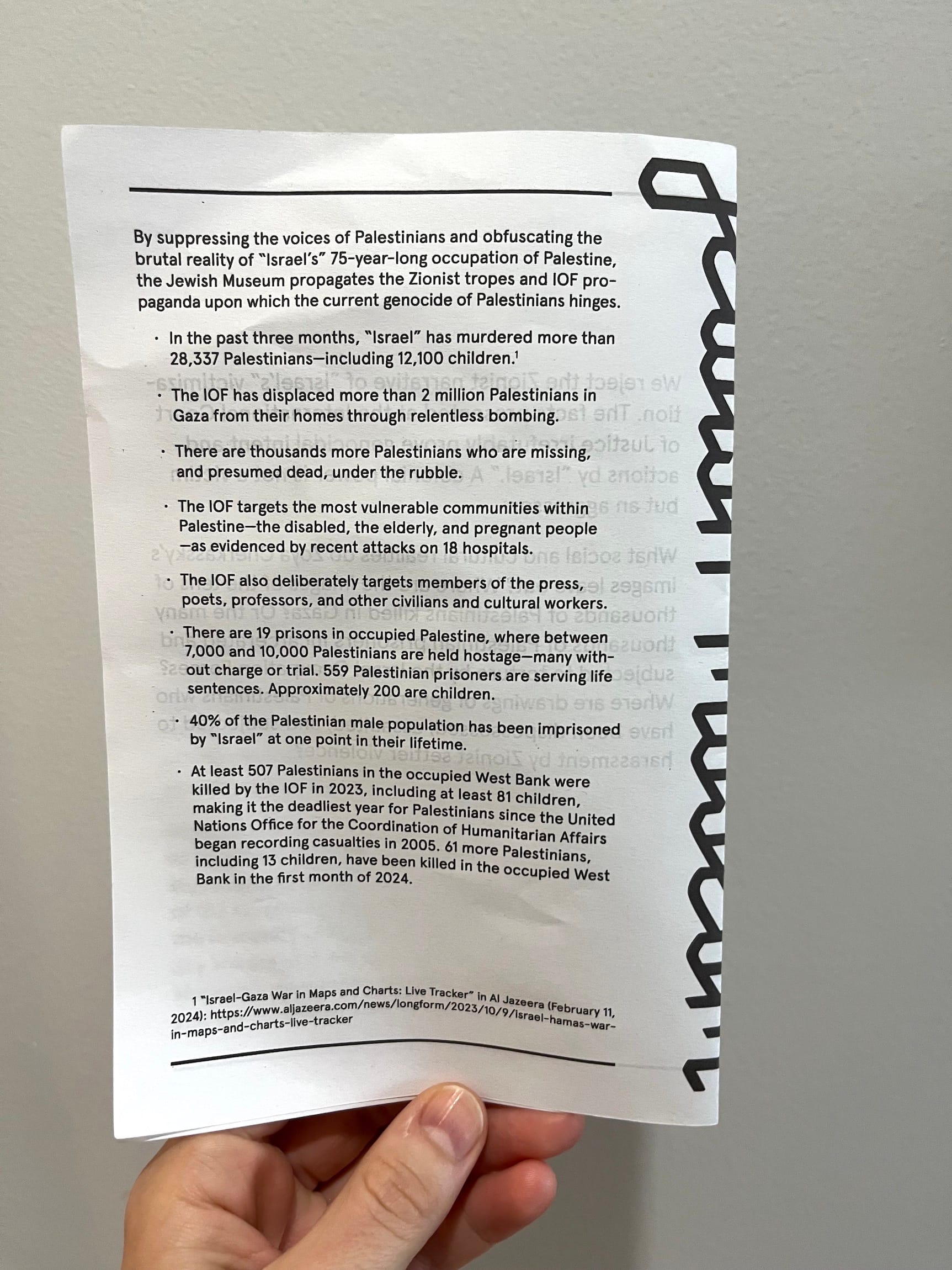 "[The Jewish Museum's] curatorial choices aim to legitimize Zionist murder, ethnic cleansing, and the destruction of Palestinian society and infrastructure," read a text on the leaflet.