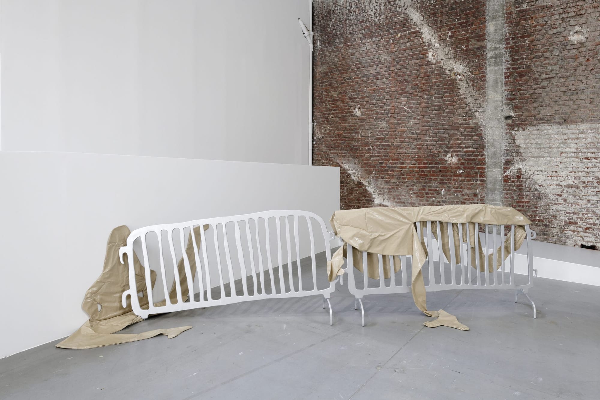 In two sound and video pieces — Dominique Petitgand’s “La question est posée” (2019-2020) and Forensic Architecture’s “Cloud Studies” (2020) — warning calls and gasses infiltrate space, demonstrating how the invisible and intangible hold equal power to inoculate or infect. The pairing of the discarded, limp crime-scene silhouettes of Pauline Curnier Jardin’s “Peaux de Dames” (2019-2020) with the inflatable, bursting CGI vixen of Kate Cooper’s “Infection Drivers” (2018) prompts the question: are bodies defined by contours or contents? Nearby, respondents to Florence Jung’s call for participation: “If you consider yourself to be doing well, write to info@newoffice.fr,” are showcased as specimens of well-being, visible but inaccessible behind a motion-activated glass door, foreclosing collectivity in favor of isolation.
