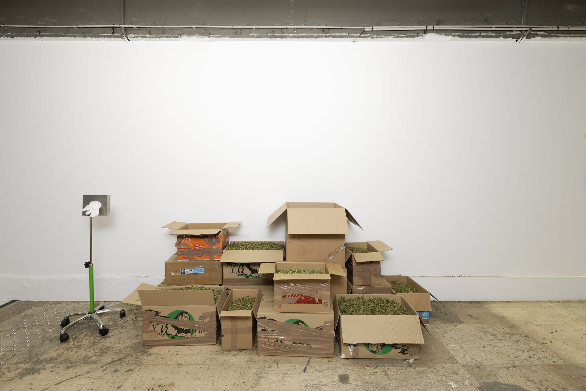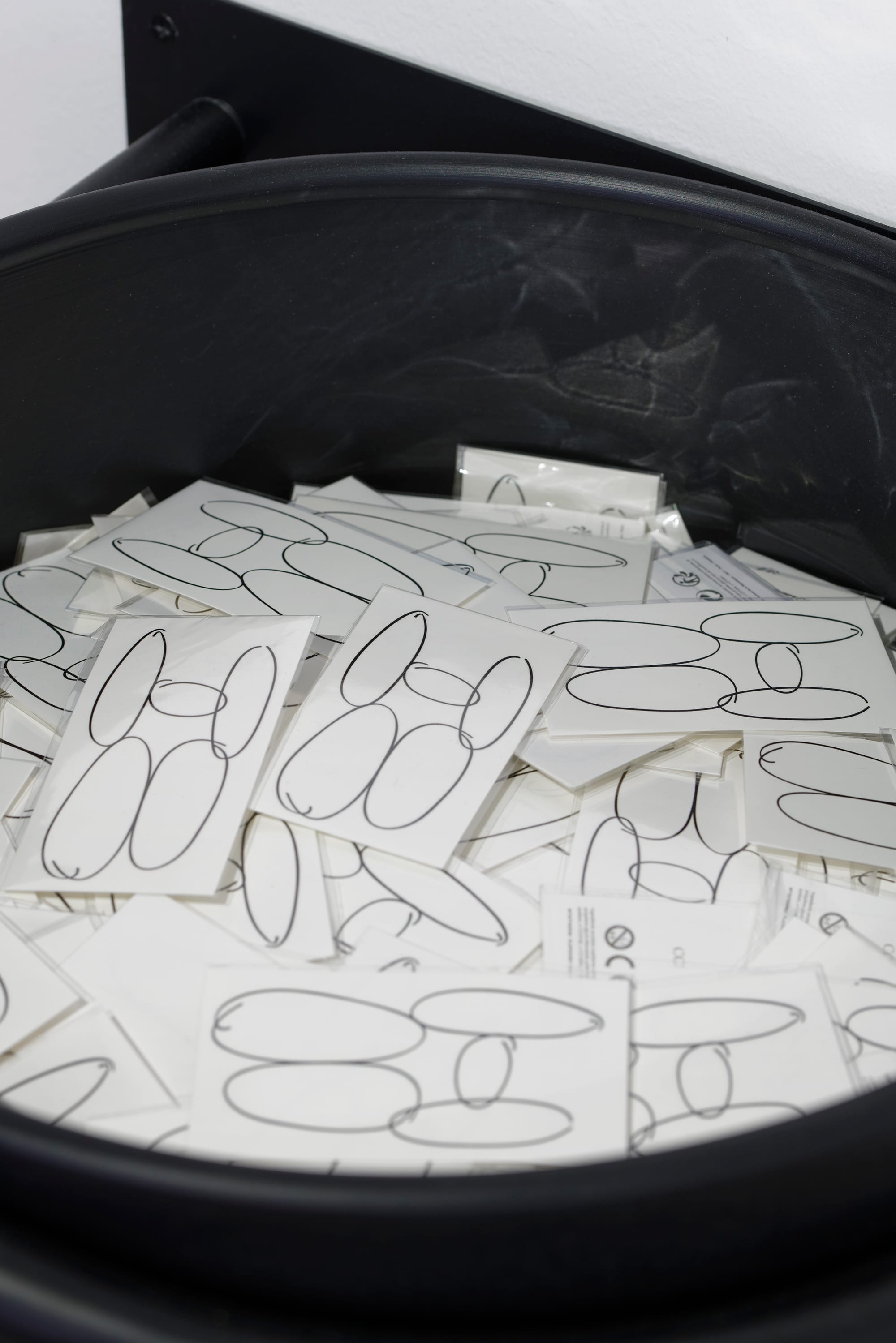 Mounting an exhibition loosely about infection, during a pandemic, presents challenges. Temporary hand sanitizers are left untouched, mistaken for art, amid marked confusion regarding new sanitary protocols in the galleries while works requiring participation are accompanied by legal disclaimers, inciting simultaneous trepidation and thrilling complicity. Whereas viewers hesitated to don disposable gynecological gloves and make off with smuggled verbena from Ghita Skali’s “Ali Baba Express Episode 3,” I observed many willingly plunge naked hands into communal bins to collect Kevin Desbouis’s temporary tattoos in “Untitled (CCM Castaner)” (both 2020). The tattoos depict a schematic body generated from a school visit by the Minister of the Interior in which he encircled body parts police are authorized to shoot. Desbouis’s headless corpse seems the ultimate anti-body, reduced by state violence to mere scribbles, yet reclaimed by viewers who unwrap, lick, and affix the image to their own epidermal envelope, briefly marking themselves as target, carrier, host.