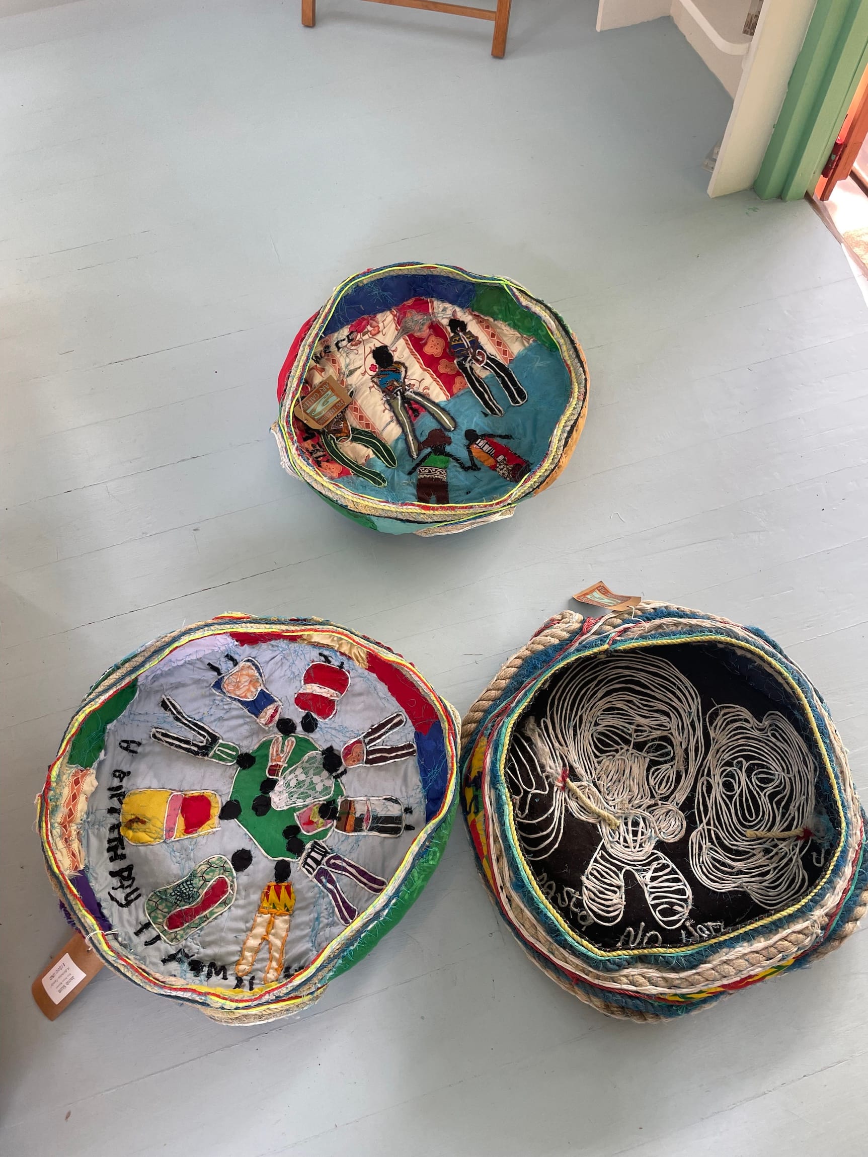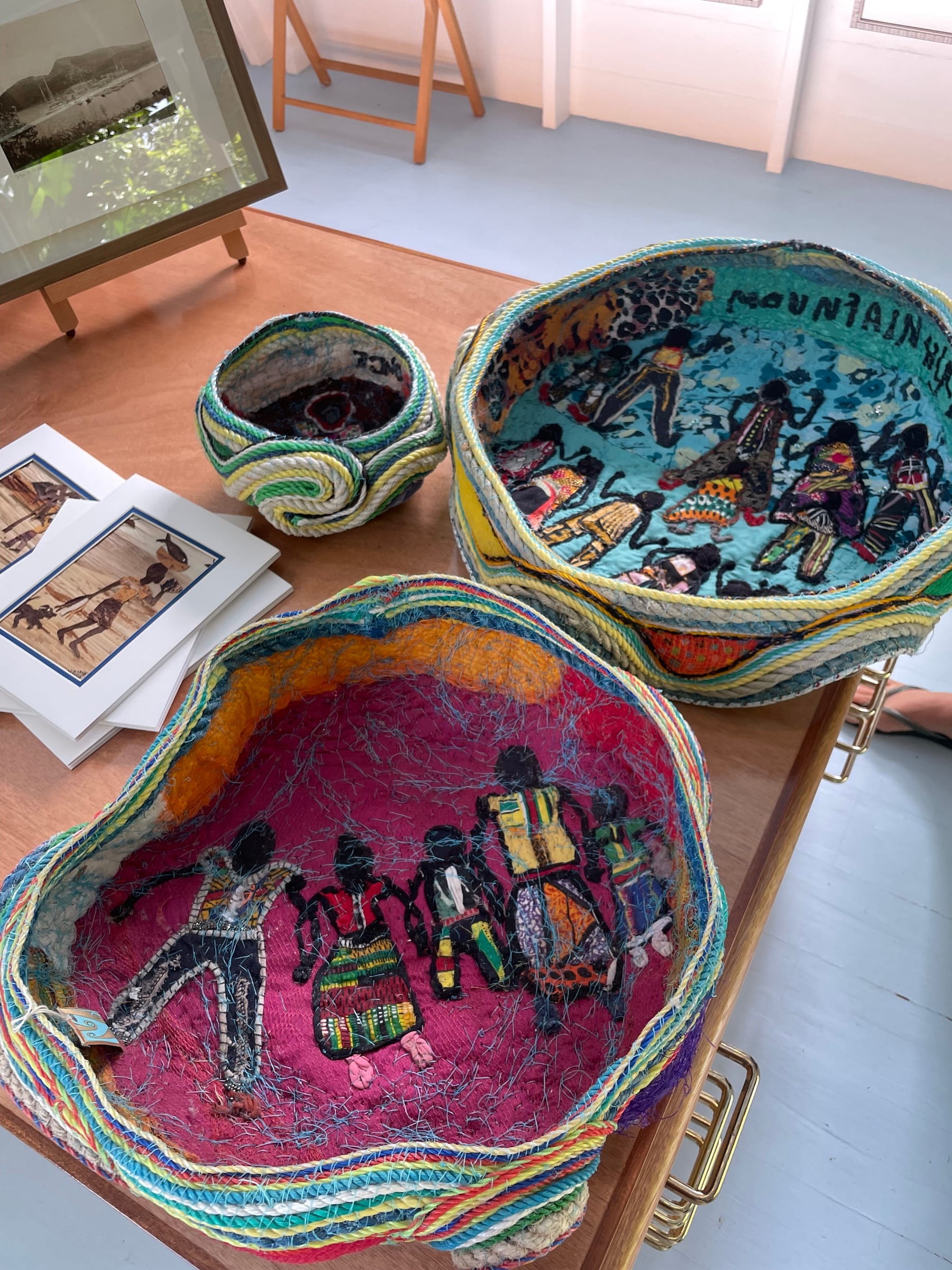 Jacob Scott from the island of Bequia uses found objects from the shoreline, such as beach rope and fishing nets, to create detailed baskets depicting Caribbean images of familial themes, varying in size and color — no two baskets are ever alike, because the materials are unique to each project. Scott had a stroke last year and is no longer able to make the sculptural works, but has switched to painting with the help of the gallery.