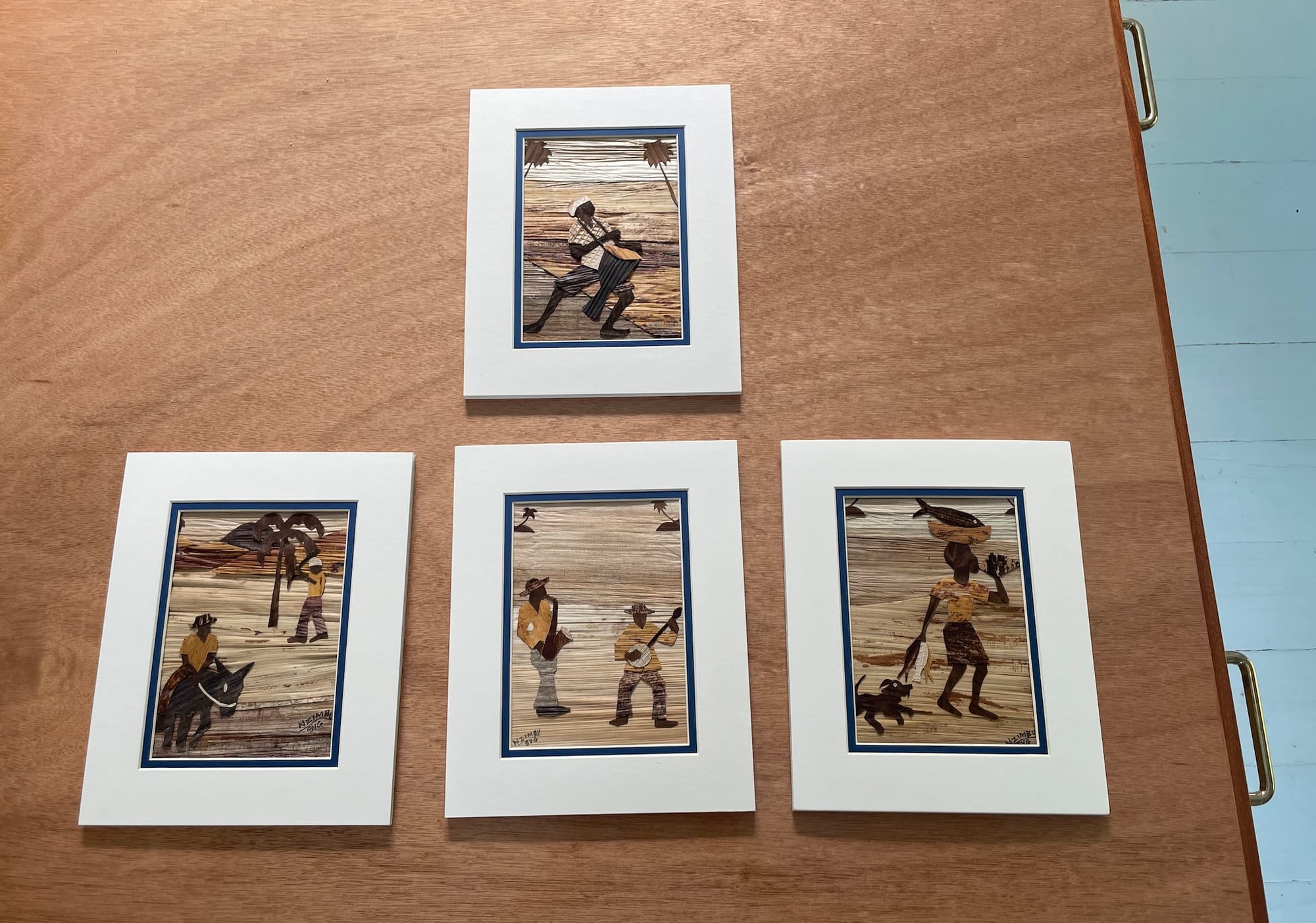 Both artists are self-taught and employ found materials to portray scenes of Caribbean life. Browne uses foraged banana leaves to depict memories of Saint Vincent and the Grenadines, such as a woman making her way home from the marketplace with a basket over her head and a dog on her heels. Another image shows a man with a machete in hand heading to harvest coconuts from a tree while a laborer passes in the foreground atop a donkey.