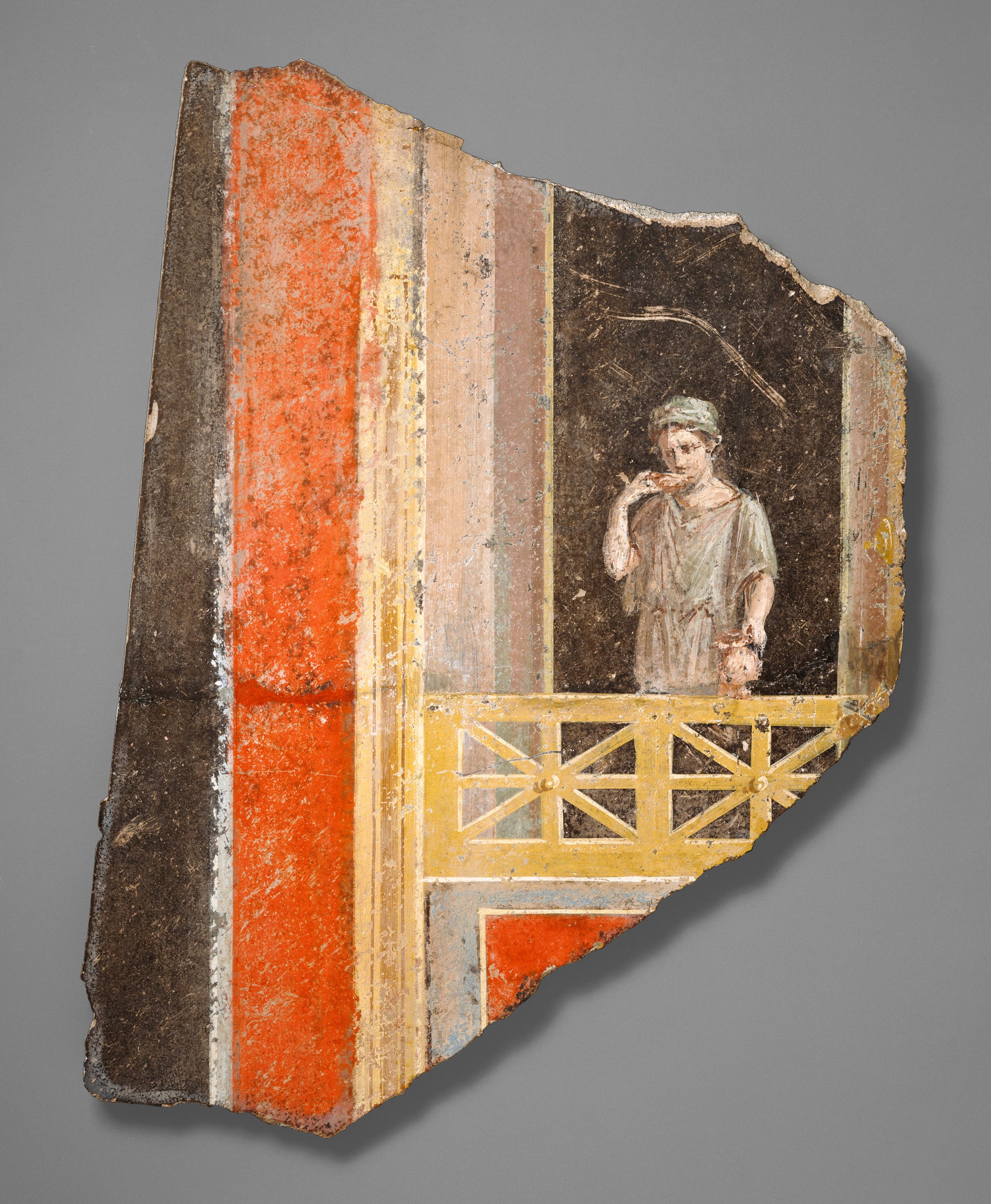 A fresco fragment currently on view at the Getty Villa was among the antiquities in the photos, he says. “Woman on a Balcony” is believed to be part of a large Roman Second Style wall painting, which perhaps decorated a dining room. It was painted in Italy — Tsirogiannis suspects that it was made in Pompeii — sometime between 10 BCE and 14 CE. In the image, a woman in a loose tunic and matching cap drinks from a cup as she balances a pitcher against a balcony railing. The fragment belonged to antiquities collectors Barbara and Lawrence Fleischman, who first exhibited the work publicly with the Getty in 1994 and donated it to the museum — along with 287 other objects — in 1996. The Getty also purchased 33 artifacts from the Fleischman collection.