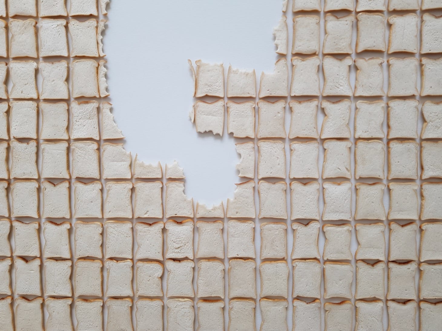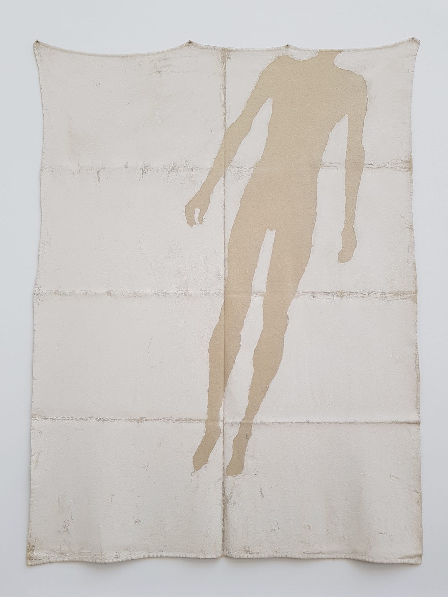 Towards the end of the exhibition, viewers encounter a second figure in the foetal position, this time so large it spills out of the enormous room in which it is sited. Viewers can choose to circumnavigate “Cave” (2019), or to enter the sculpture though its hollow feet. Initially pitch black, the tunnel opens up into the figure’s cavernous torso, where shafts of light partially illuminate the dark bodily interior.