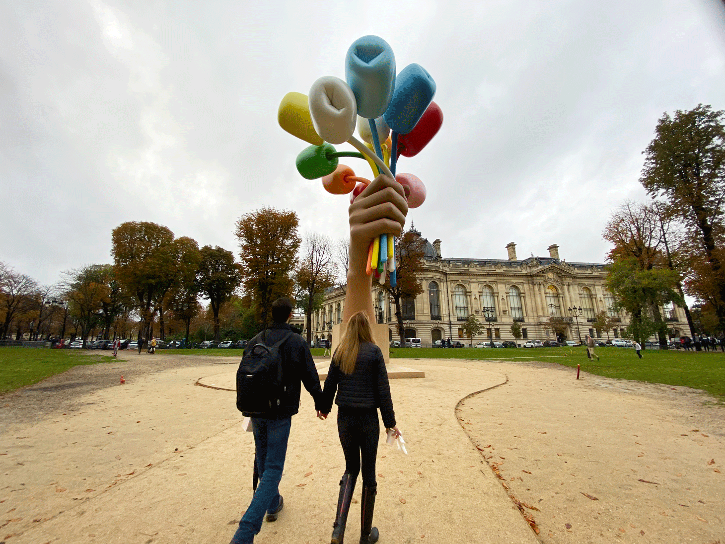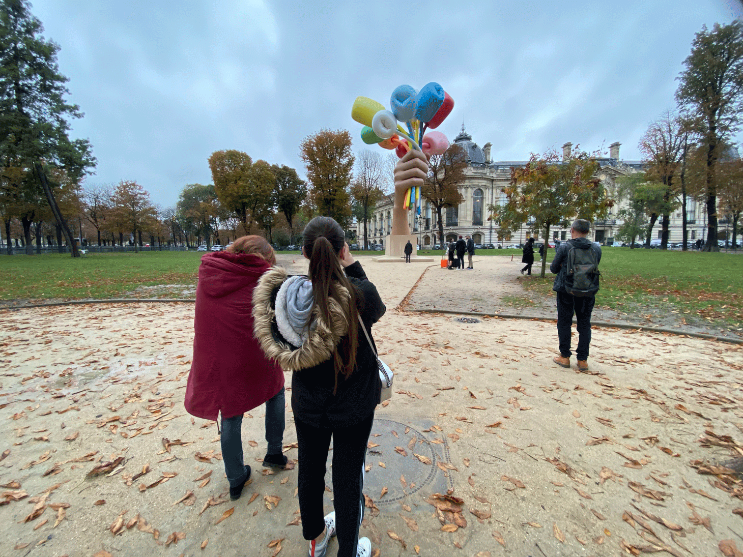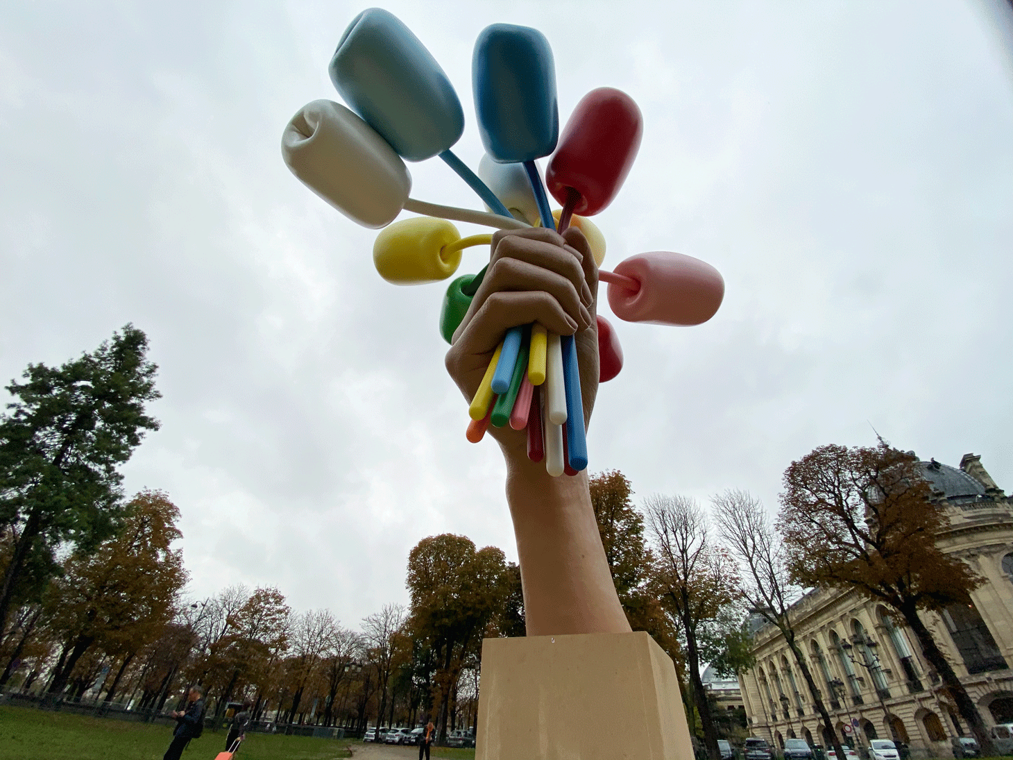 Garrett Epp, a professor of literature from Canada who’s currently teaching at the University of Lille north of Paris, was just out of the Paris Photo exhibition at the adjacent Grand Palais before coming to observe the bouquet. “I find it somewhat hilarious,” he said. “I’m not a big fan of Jeff Koons’s work overall, but this is amusing enough that I kind of like it.”