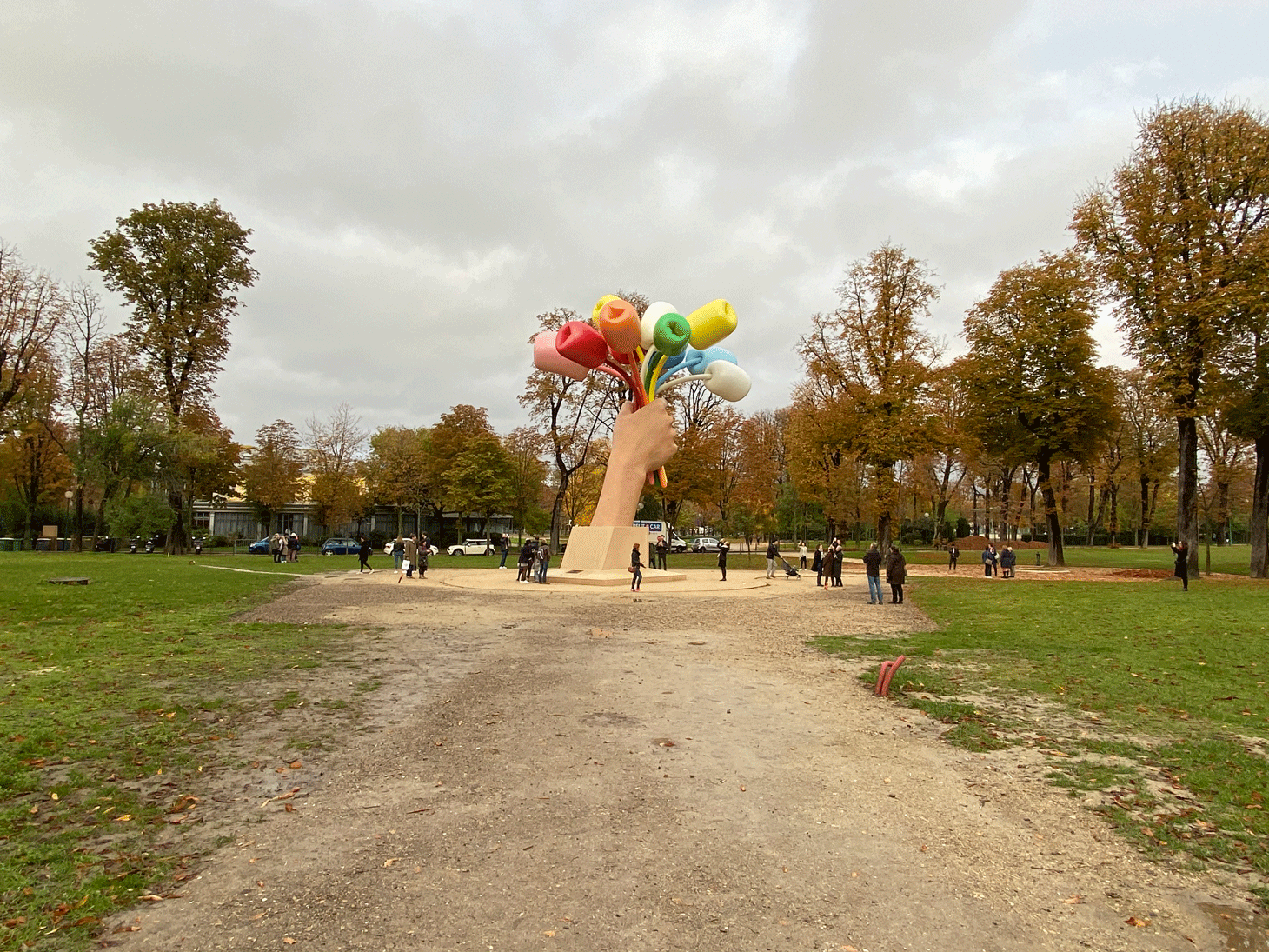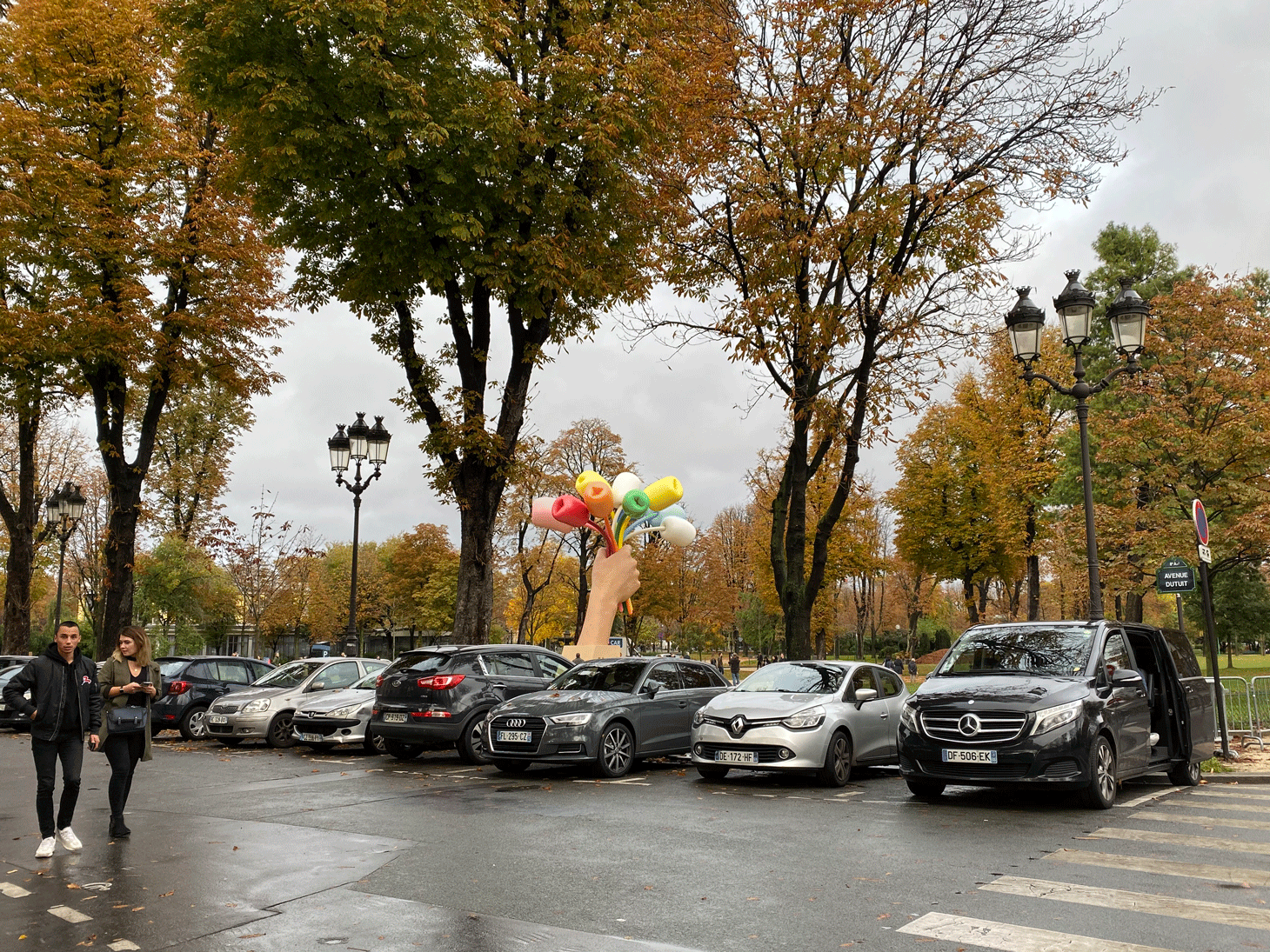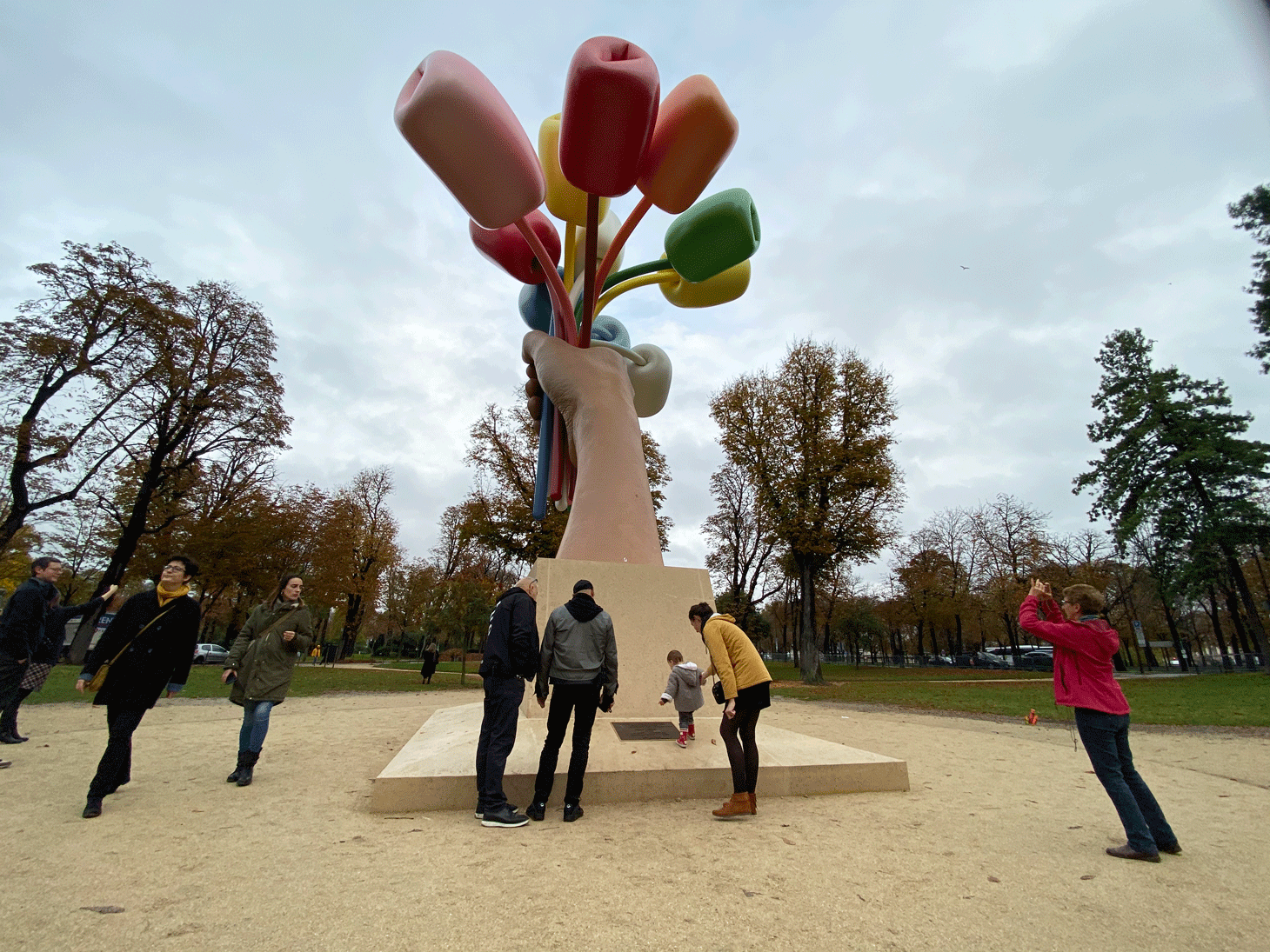 Garrett Epp, a professor of literature from Canada who’s currently teaching at the University of Lille north of Paris, was just out of the Paris Photo exhibition at the adjacent Grand Palais before coming to observe the bouquet. “I find it somewhat hilarious,” he said. “I’m not a big fan of Jeff Koons’s work overall, but this is amusing enough that I kind of like it.”