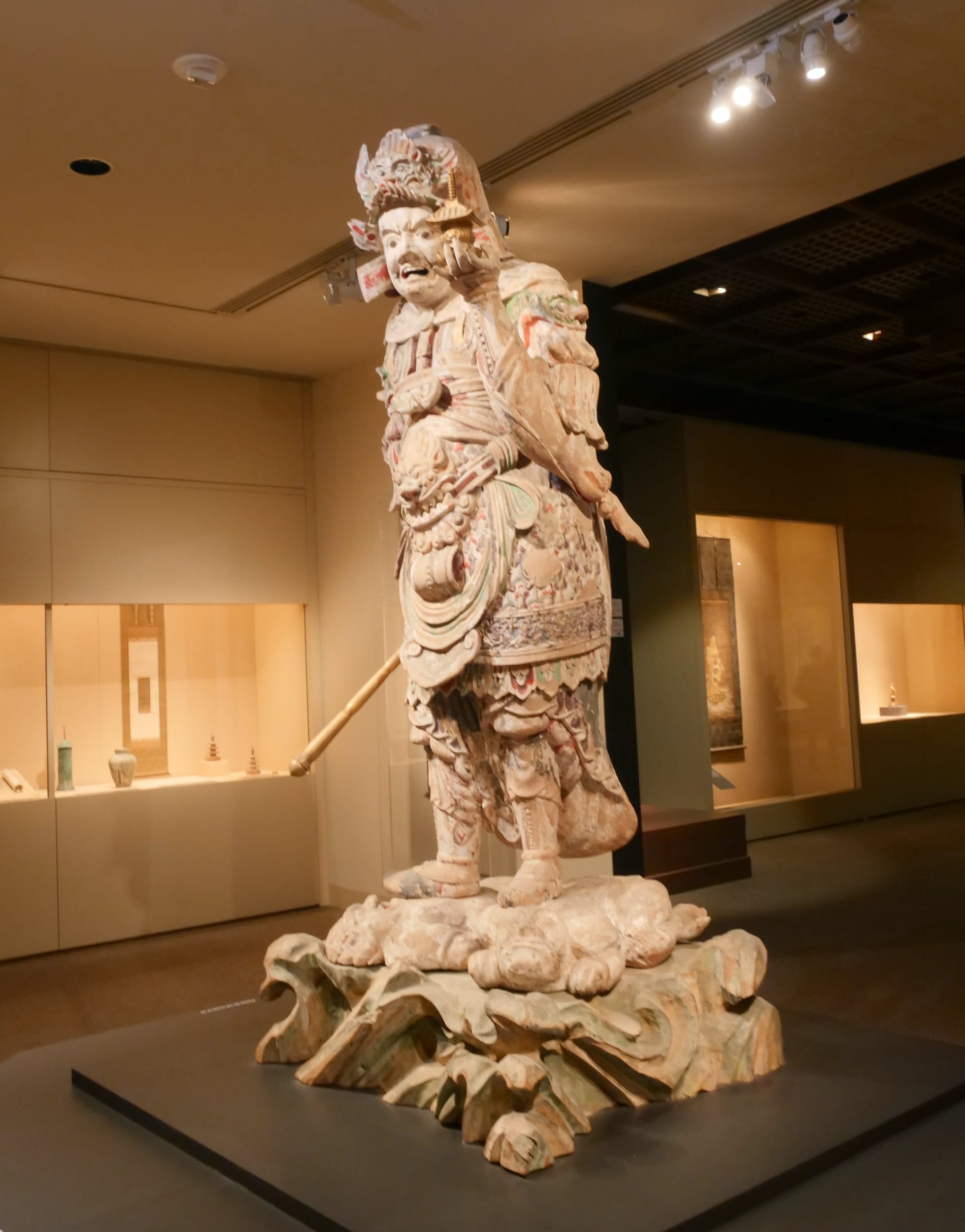 What I appreciate most about the show is its careful guidance into the many cosmologies of Buddhist practice. While Japanese Buddhism is often synonymous with the spare, minimalist aesthetics of Zen, the statue of Bishamonten, Guardian of the North, towering nearly seven feet high, shows a spiritual warrior in sumptuous dress atop two demons, indicating his role as a protector against evil spirits.